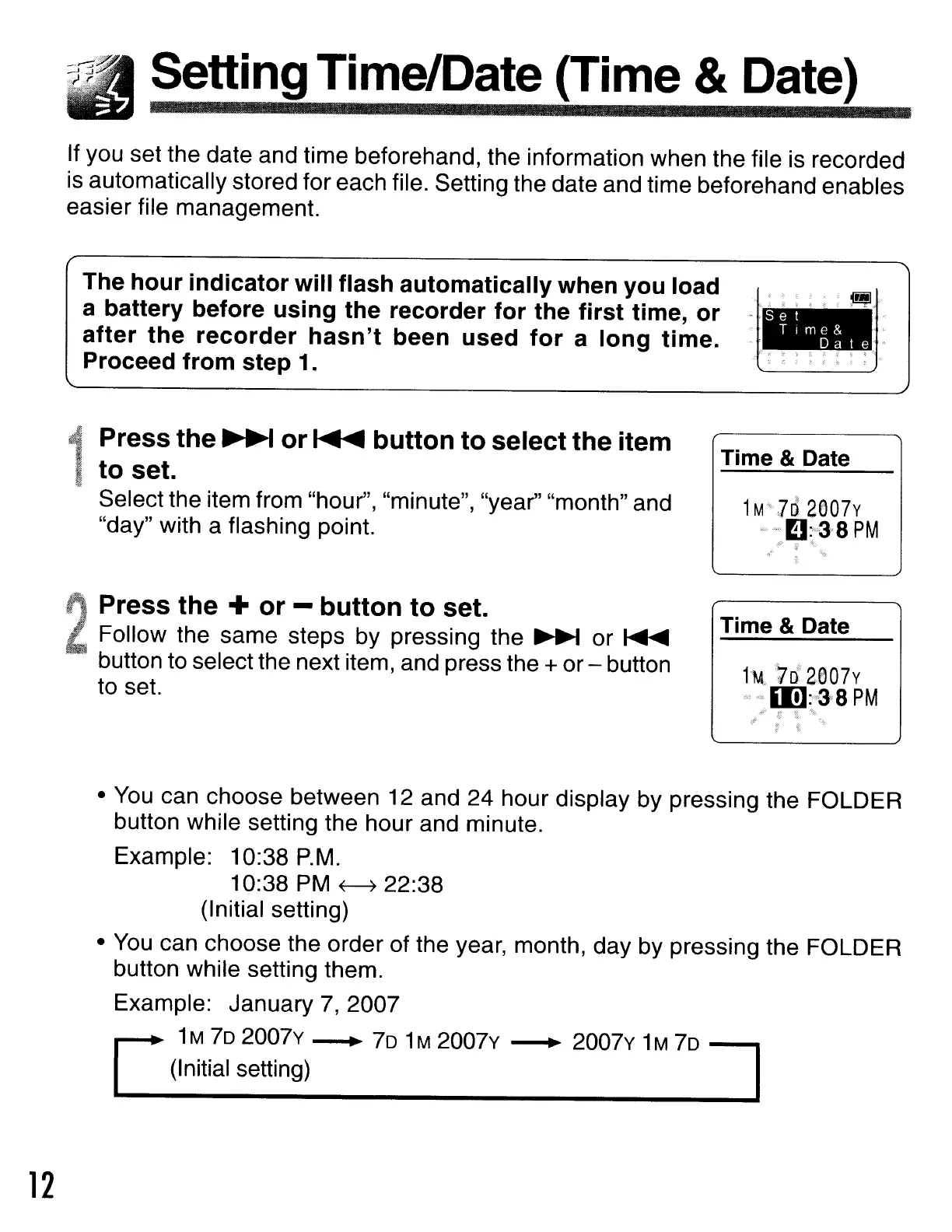 • You can choose between 12 and 24 hour display by pressing the FOLDER