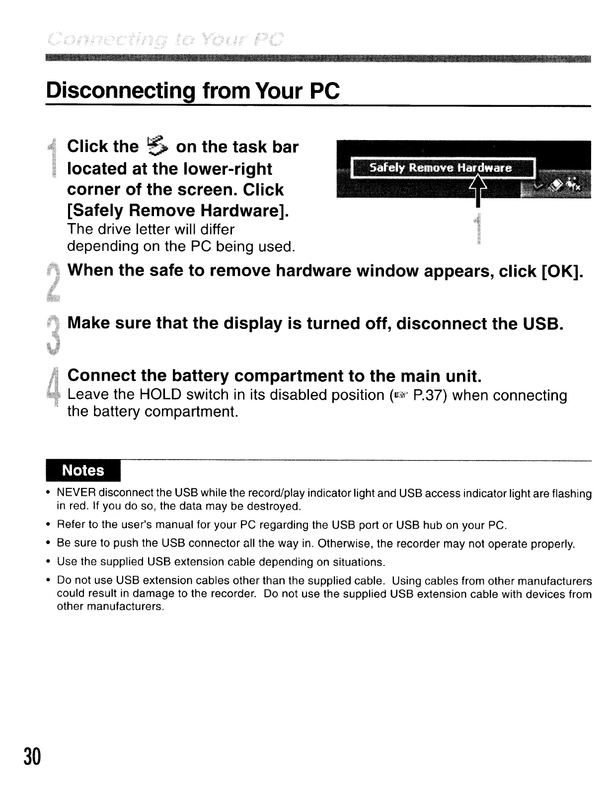 • NEVER disconnect the USB while the record/play indicator light and USB access indicator light are flashing