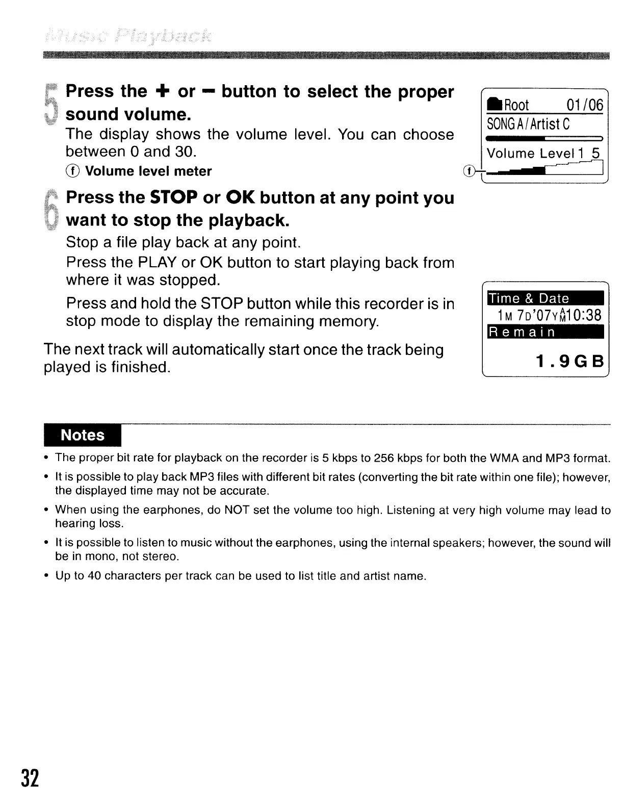 • The proper bit rate for playback on the recorder is 5 kbps to 256 kbps for both the WMA and MP3 format.