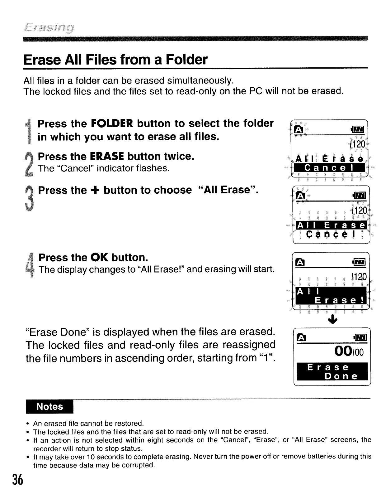 "Erase Done" is displayed when the files are erased.