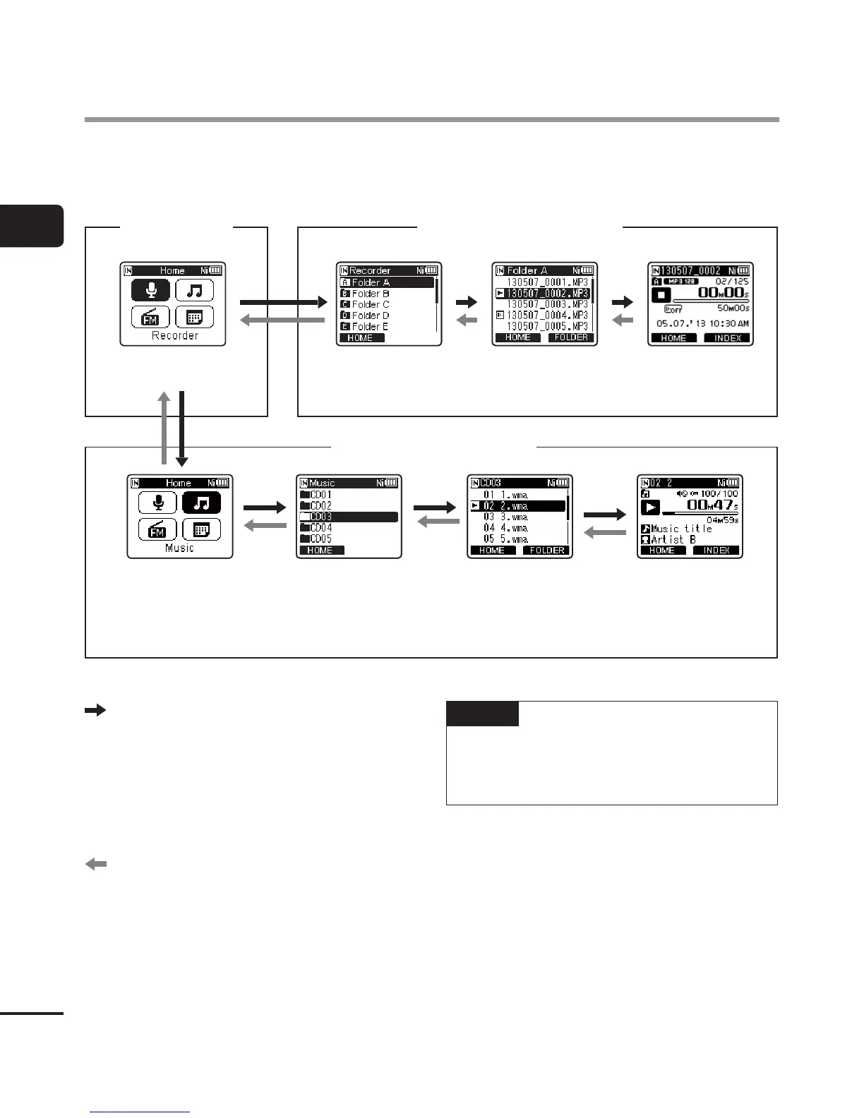 “Folders” (☞P.23) for a description of the voice recorder’s hierarchical folder structure.