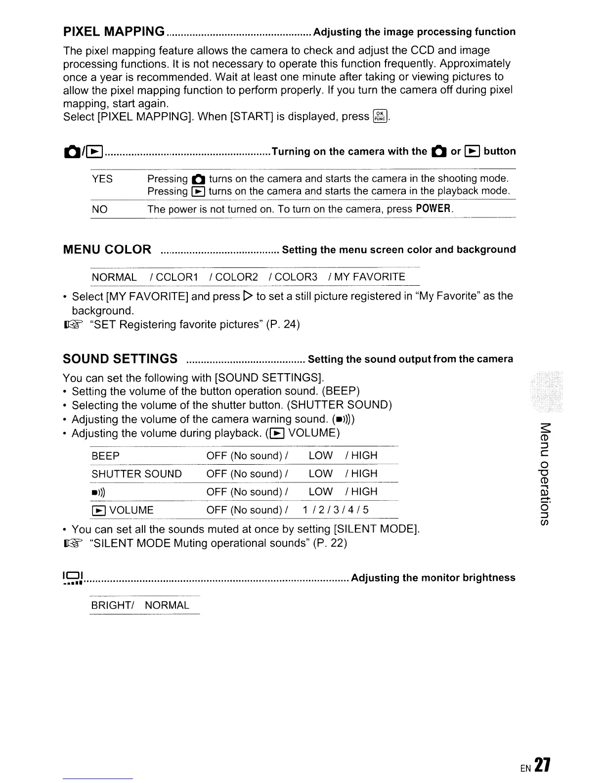 "SILENT MODE Muting operational sounds" (P. 22)