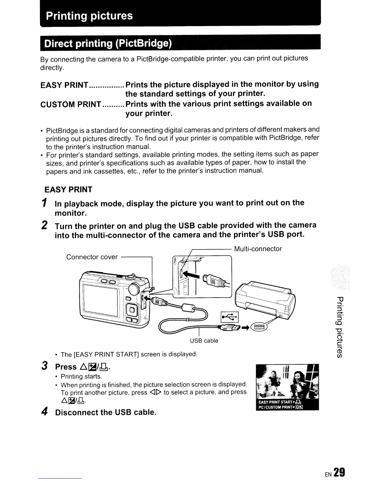 By connecting the camera to a PictBridge-compatible printer, you can print out pictures
