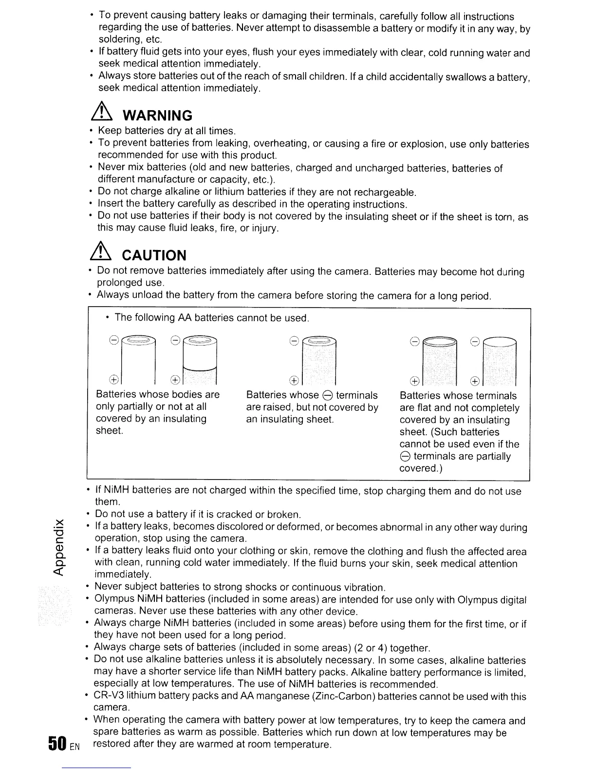 • Do not use batteries if their body is not covered by the insulating sheet or if the sheet is torn, as