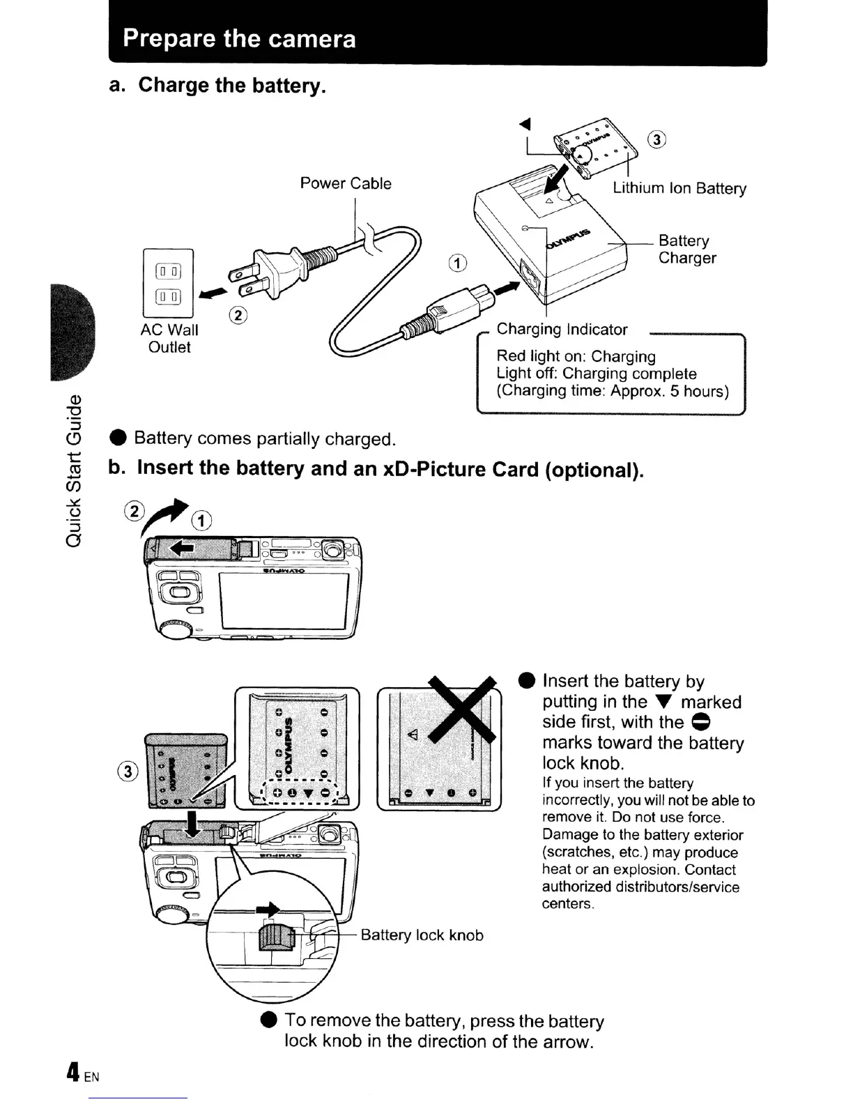 Insert the battery and an xD-Picture Card (optional).