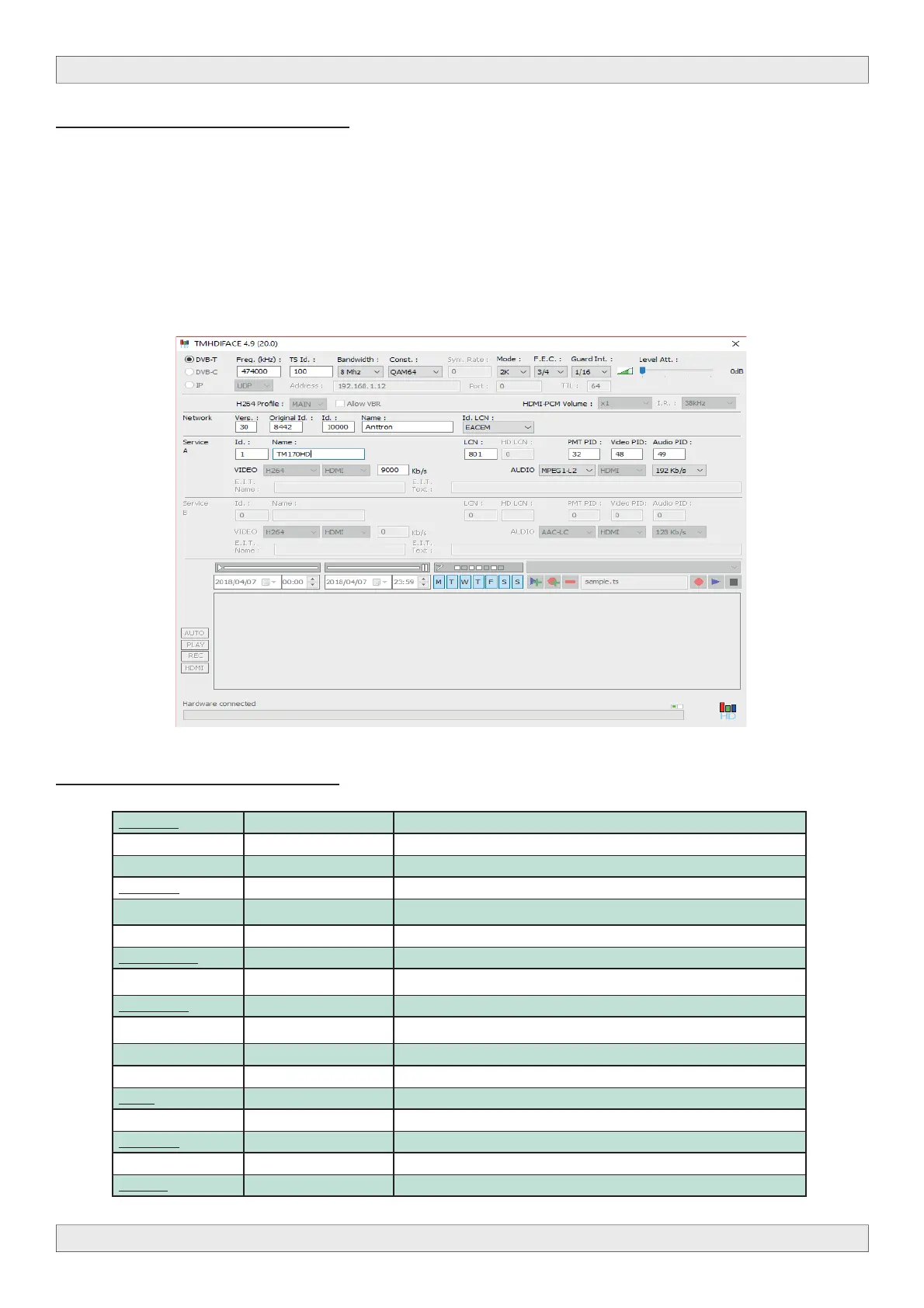 Confi gura on Channel/network name, SID, LCN, TSID, ONID, NID, versions, audio, video PIDs…