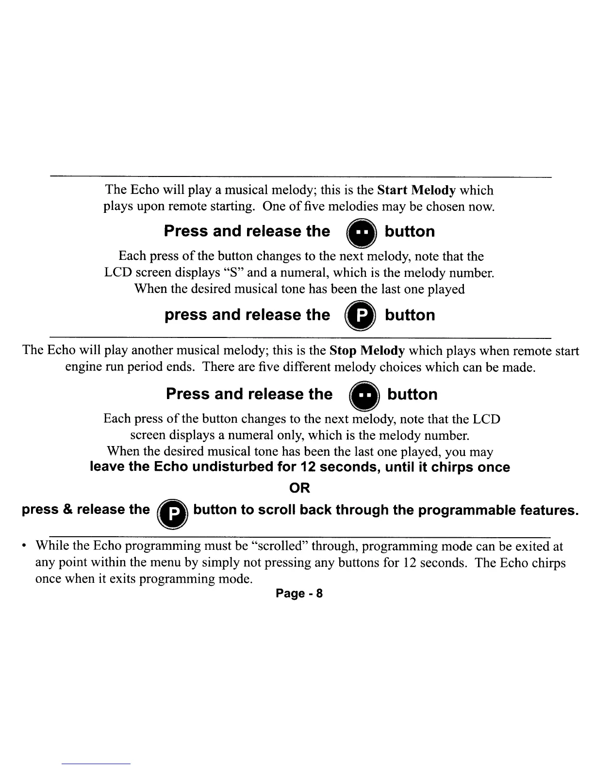 • While the Echo programming must be "scrolled" through, programming mode can be exited at