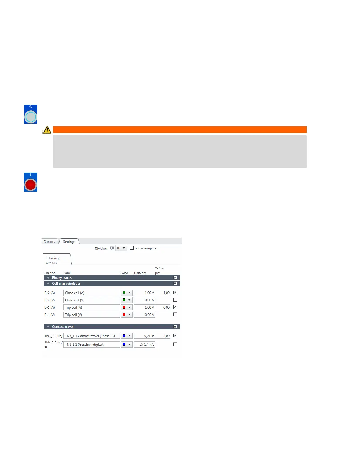 To view the numeric measurement data, click the Table tab. For the operating times, auxiliary contact