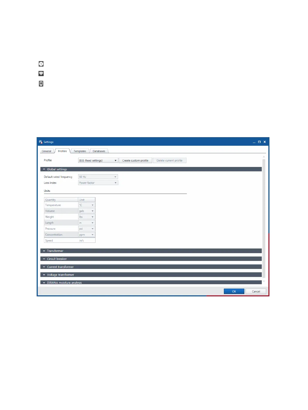 On the Profiles tab, you can set your profile, the default rated frequency, the loss index, the units of your