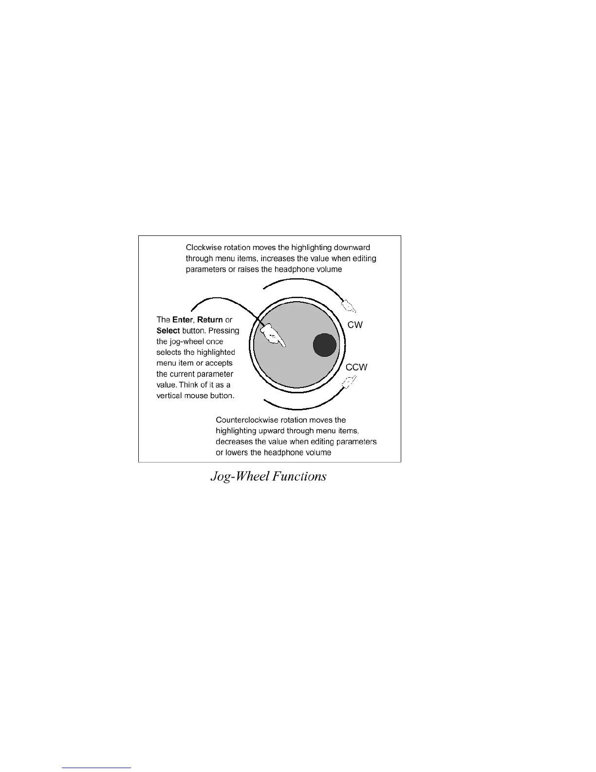 See the diagram below to learn how each movement of the jog wheel affects the various menu options.
