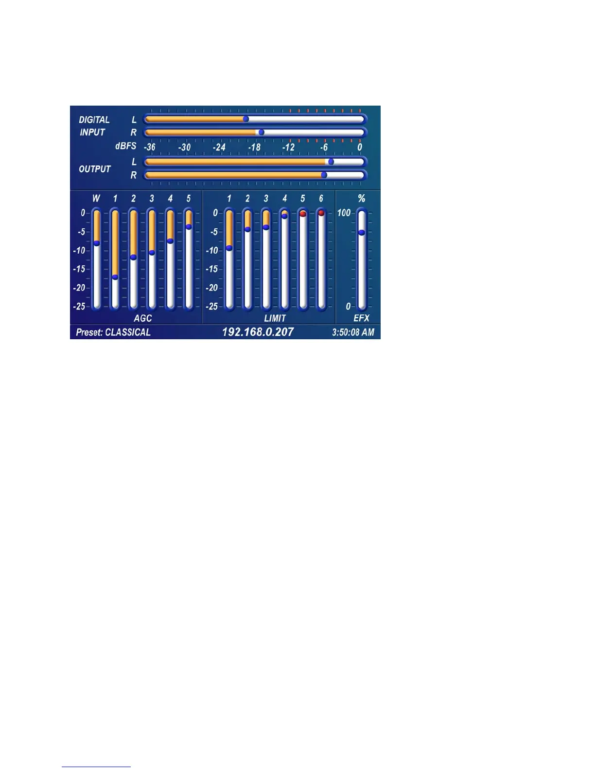 in the digital domain. Both input and output levels are displayed in real time. The “bouncing balls” indicate sample-
