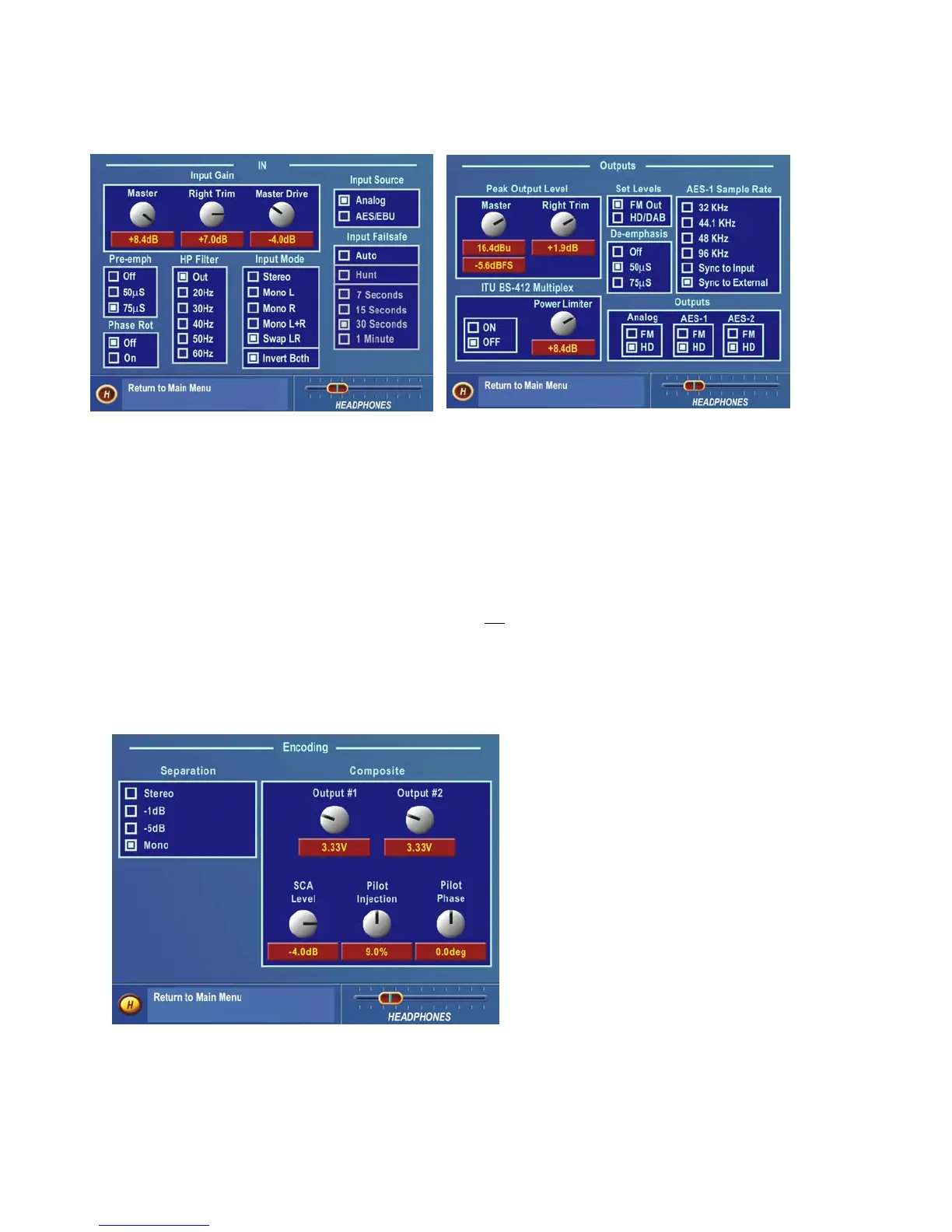 AES/EBU), signal mode (Stereo or Mono) and whether Pre-emphasis and De-emphasis is applied are also found on