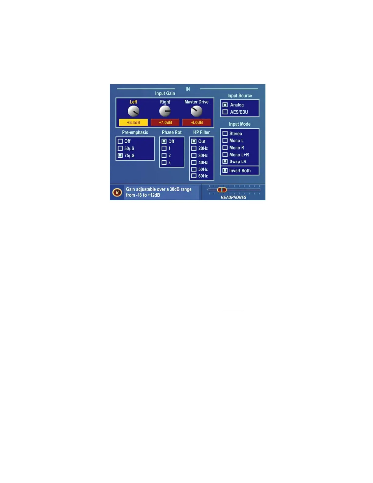 Using normal program audio, a correct gain setting results in peak indications (the “bouncing balls”)