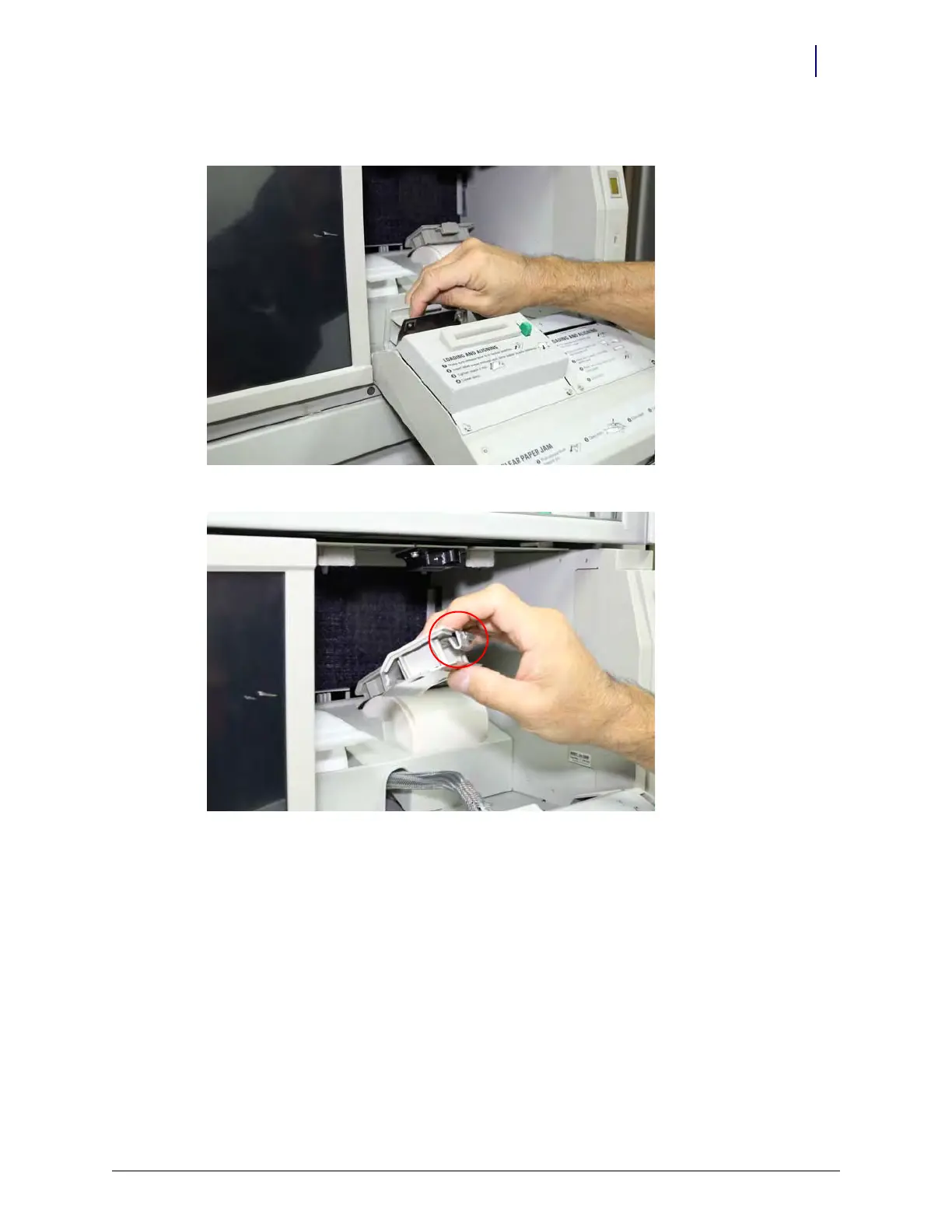 Figure 13-34. Removing rear printer panel. Note position of thumb on latch