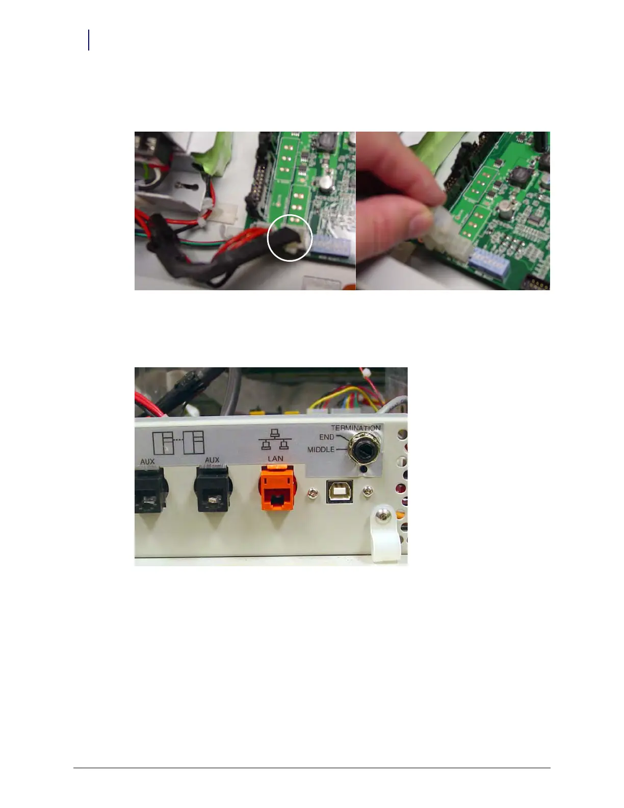 Figure 4-2. Location and labels for LAN and AUX cable connections on CT PC tray