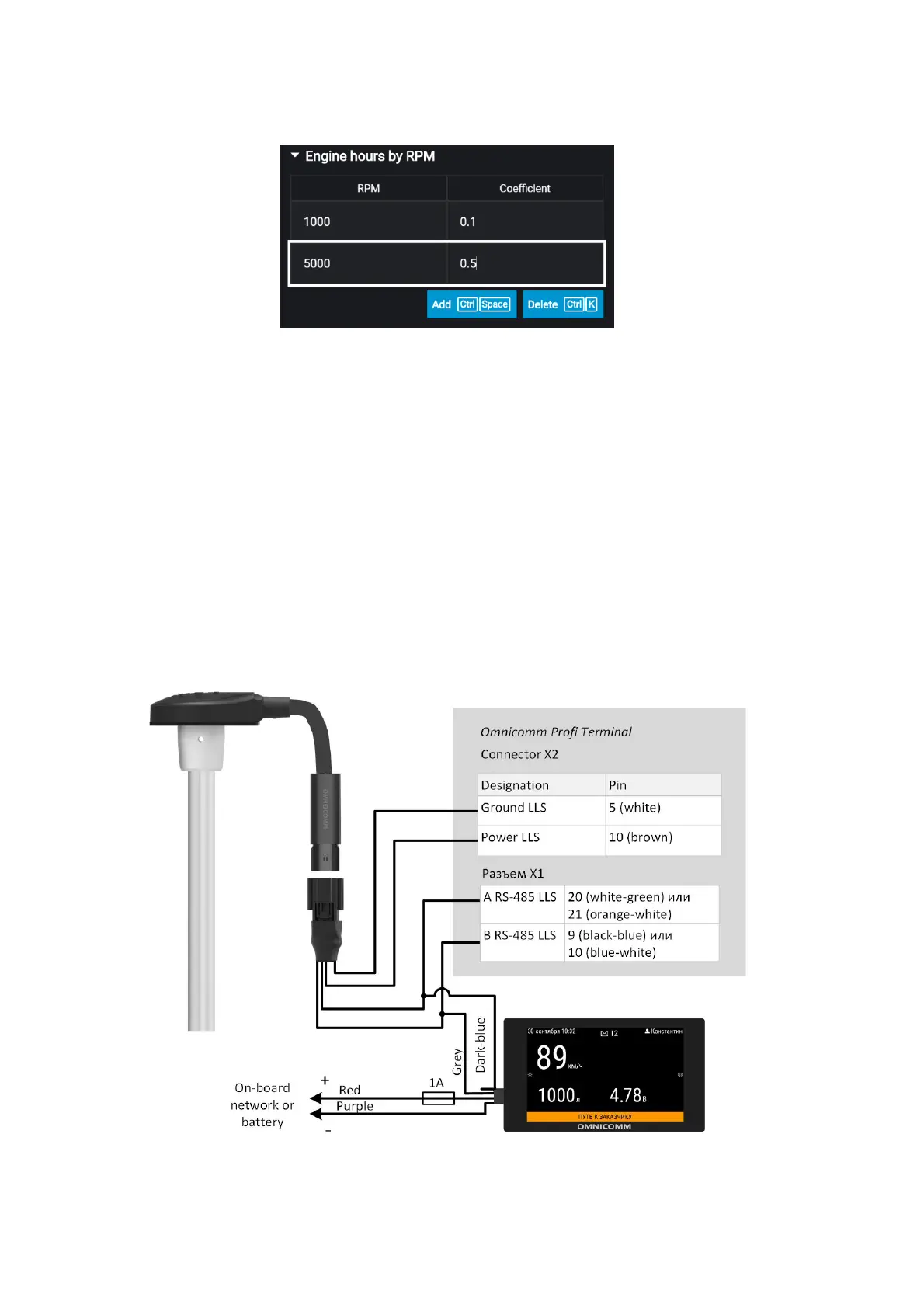 Connect Omnicomm Profi terminal to Omnicomm ICON display according to the