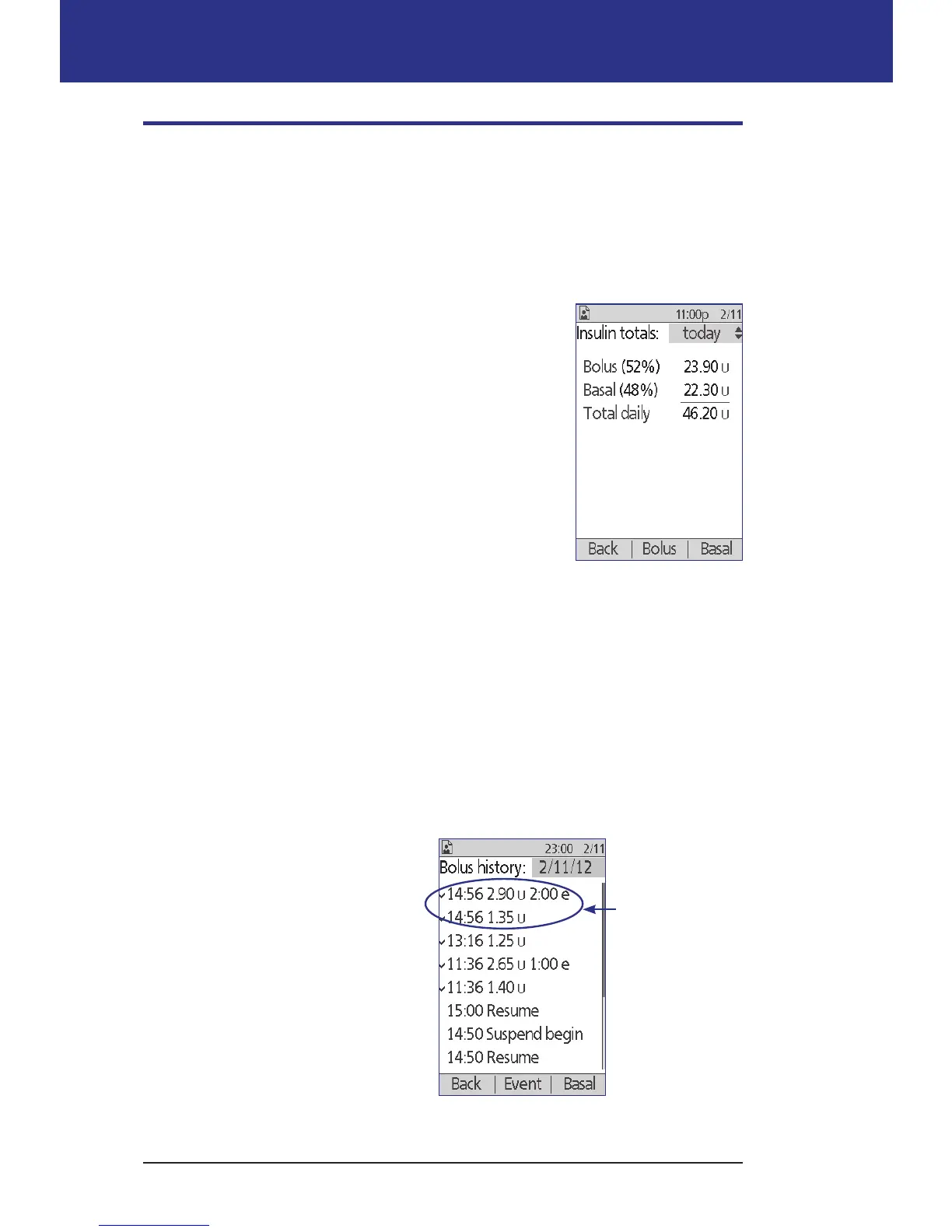 e bolus history screen displays a day-by-day list of the time and units of insulin