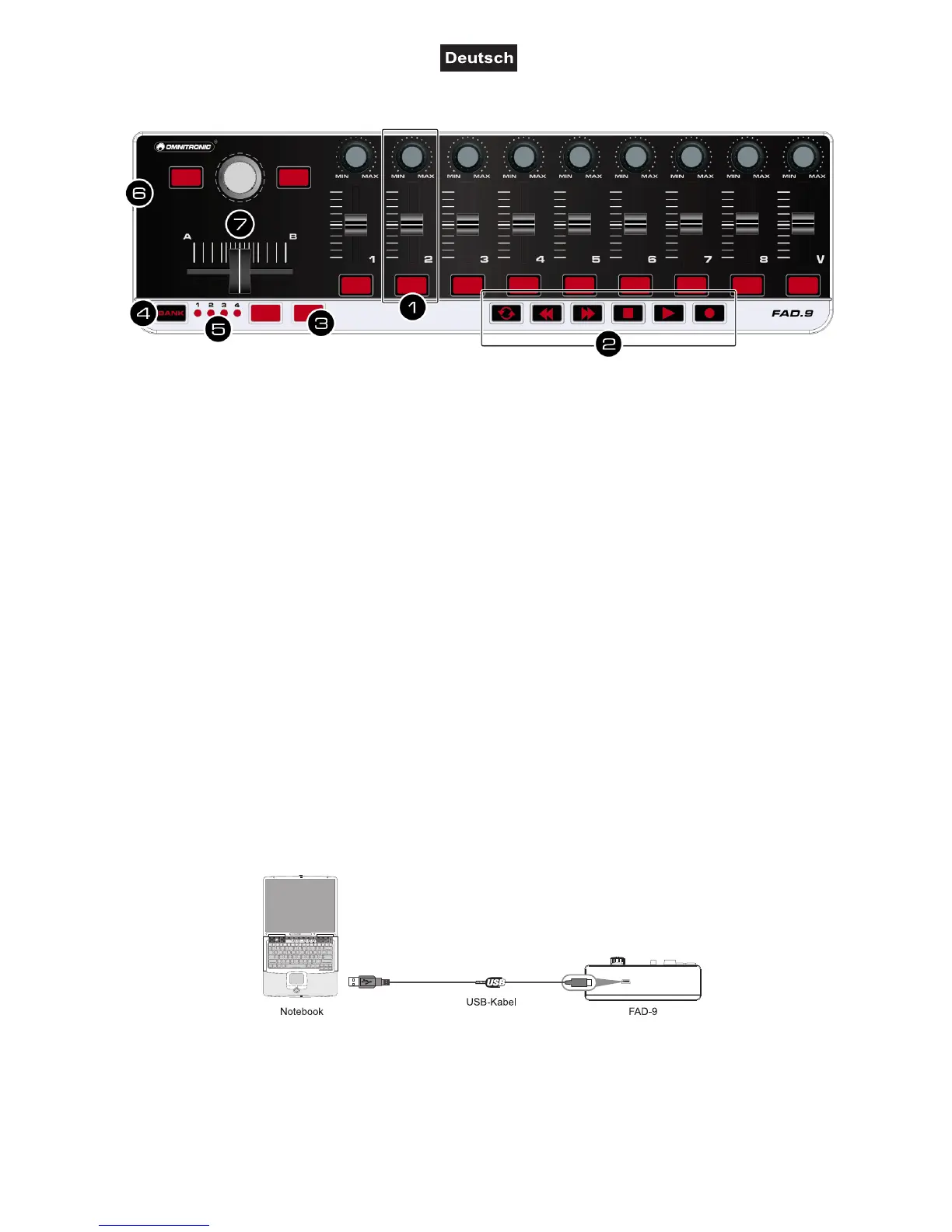 • Fader: Zum Regeln der Gesamtlautstärke.
