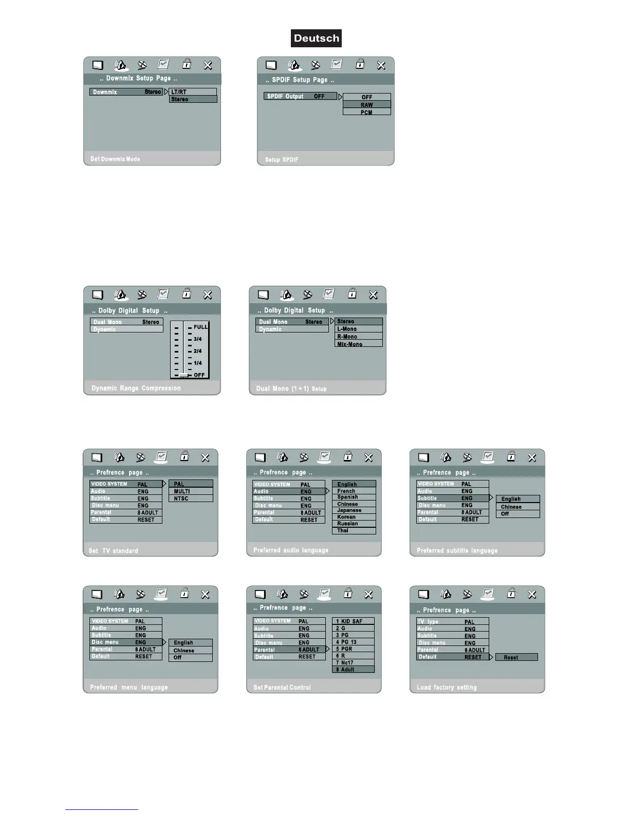 Unter Downmix können Sie ein Dolby Pro Logic Format (LT/RT) oder Stereo einstellen.