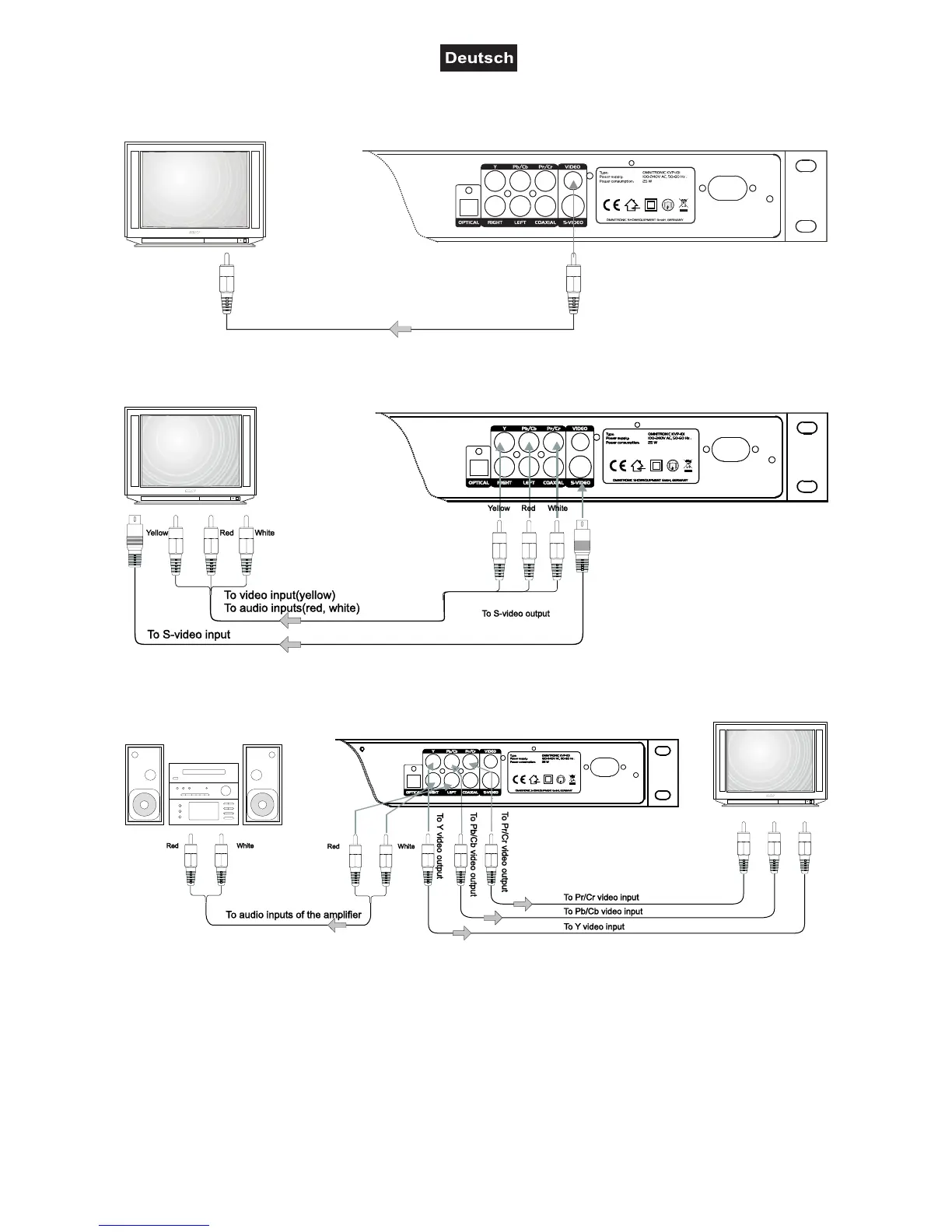 b) Schließen Sie den Fernseher über ein AV-Cinch-Kabel (gelb, rot, weiß) oder über ein S-Video-Kabel an