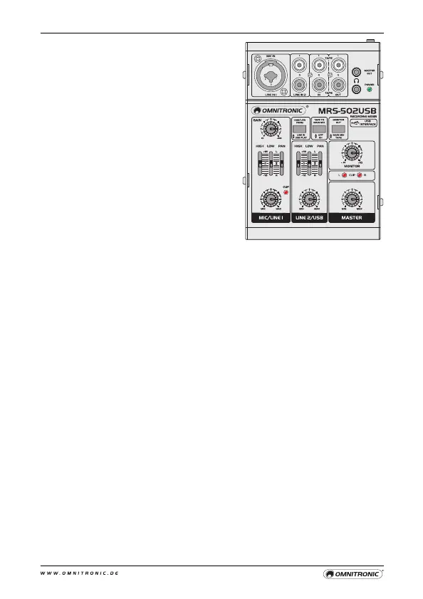 • 1 mono input channel with gain control, 2-band EQ and pan control, clip LED