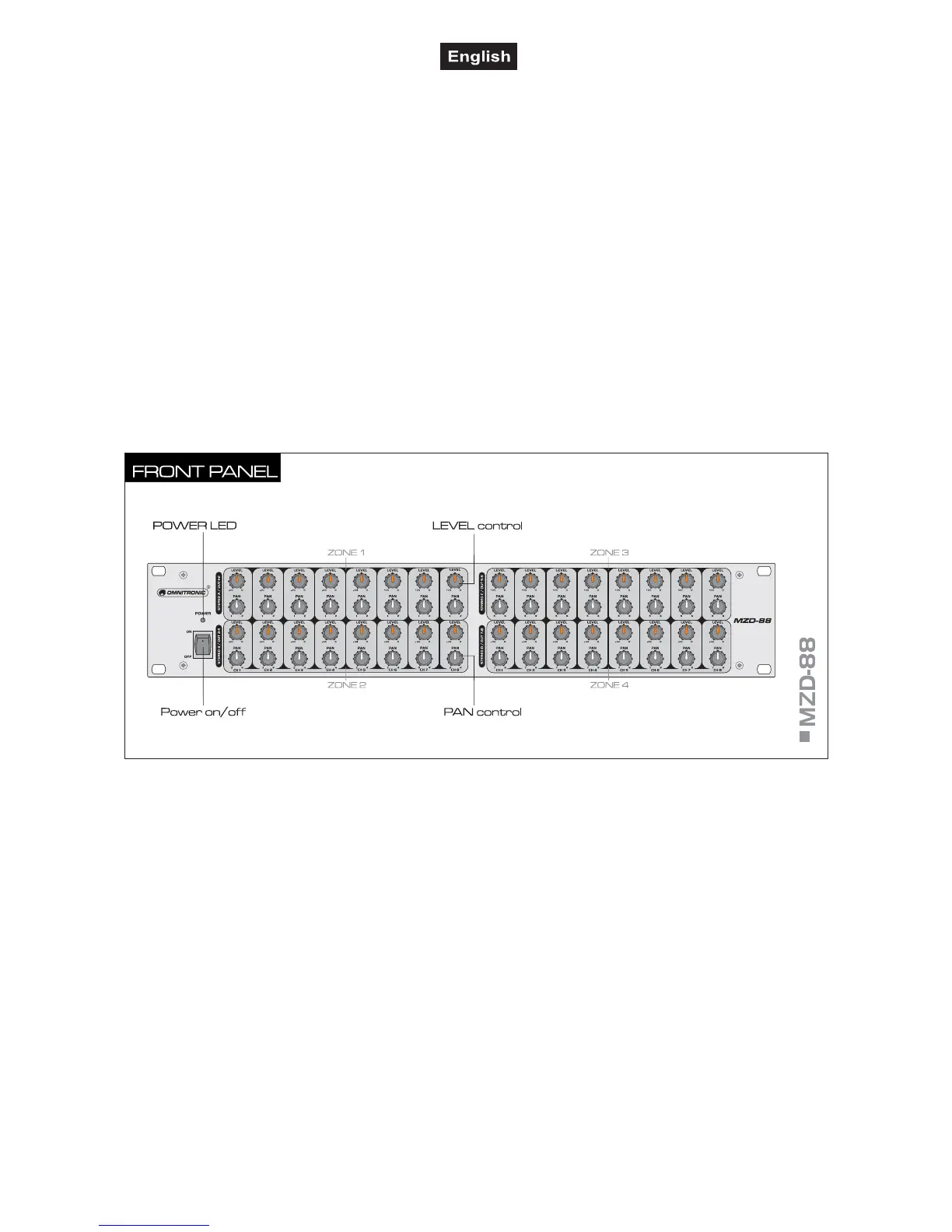 operating elements are on the front panel. The unit features four PA zones with eight identical channels