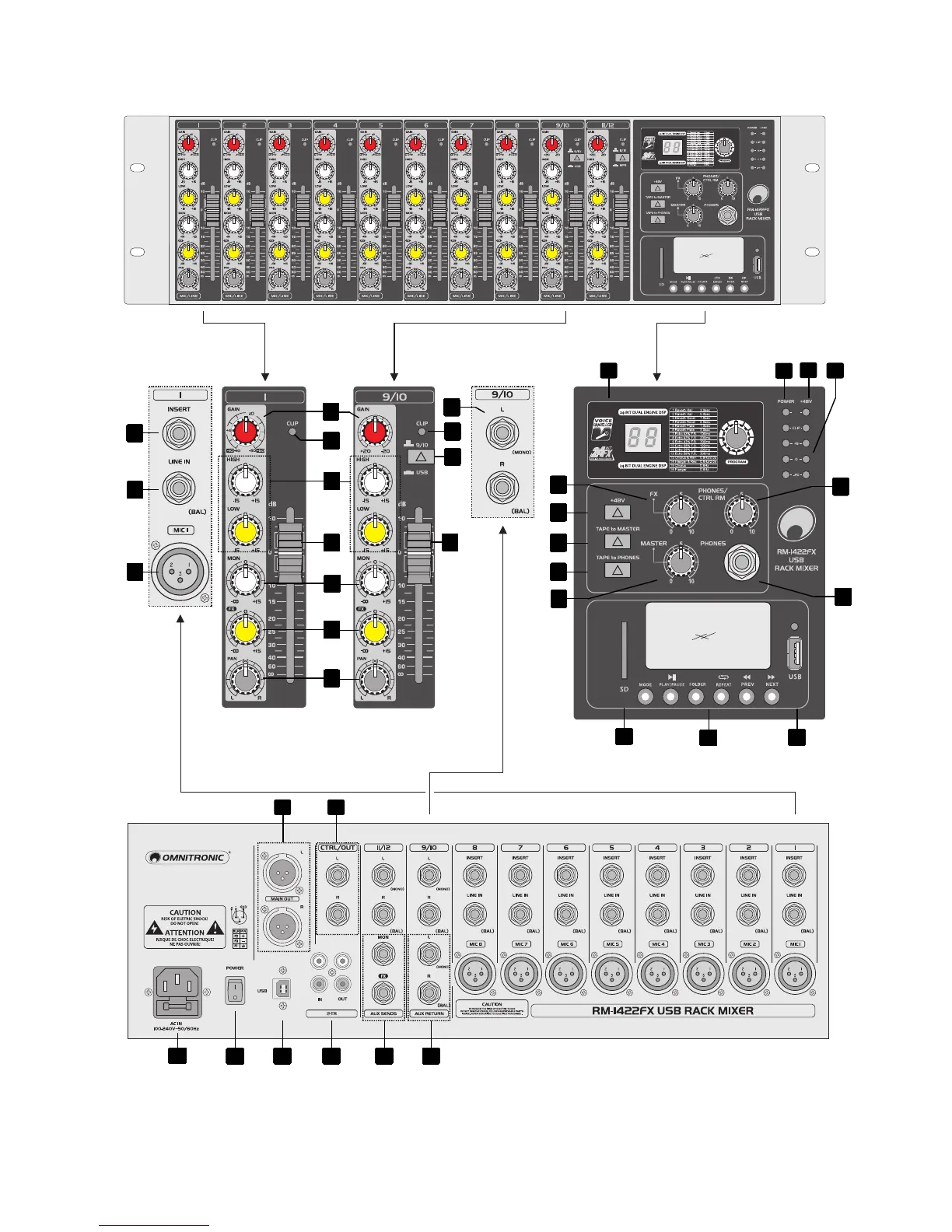 Omnitronic RM-1422FX USB - Operating Elements and Connections Overview