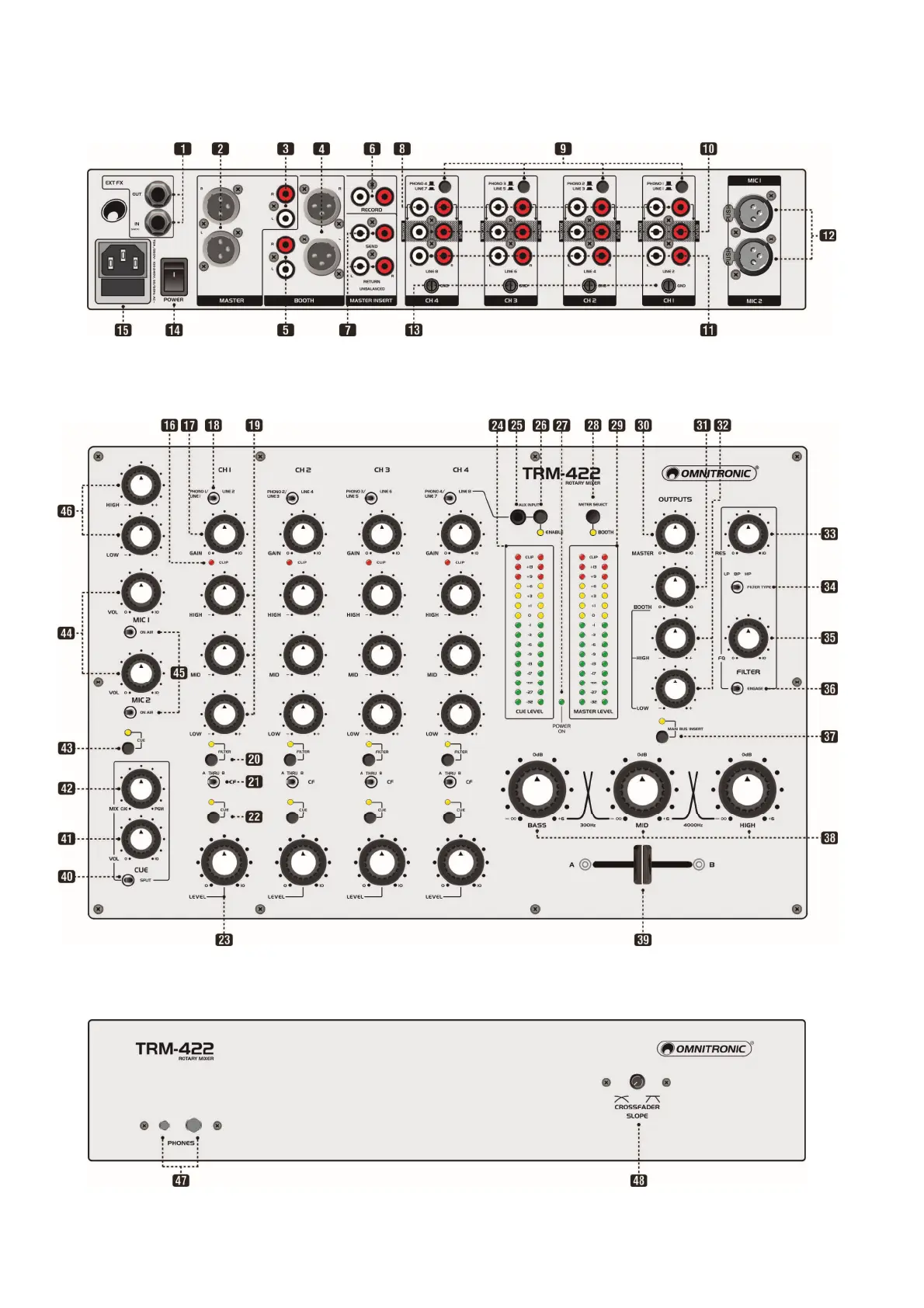 Omnitronic TRM-422 - Bedienelemente und Anschlüsse; Rückseite; Oberseite; Vorderseite