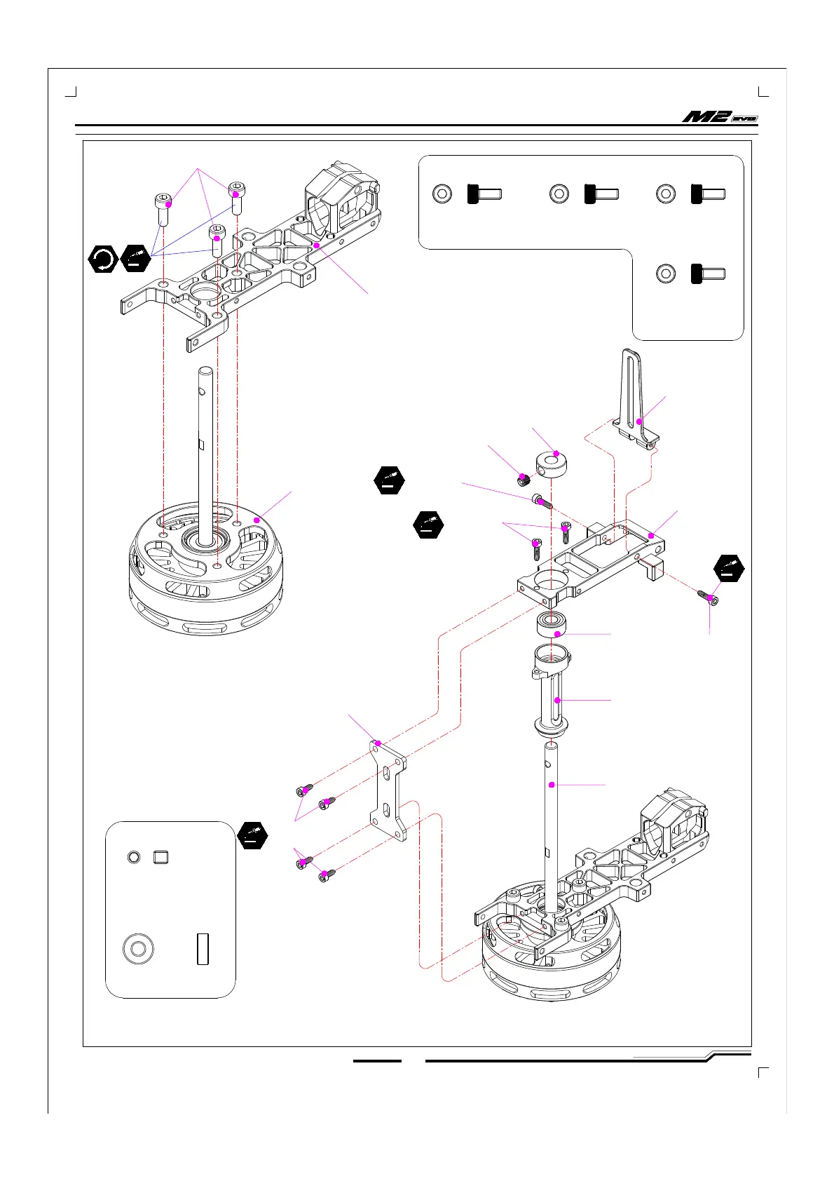 OMP Hobby M2 Evo - Assembly Step 2: Motor and Shaft Installation; Motor Mount and Main Shaft Assembly
