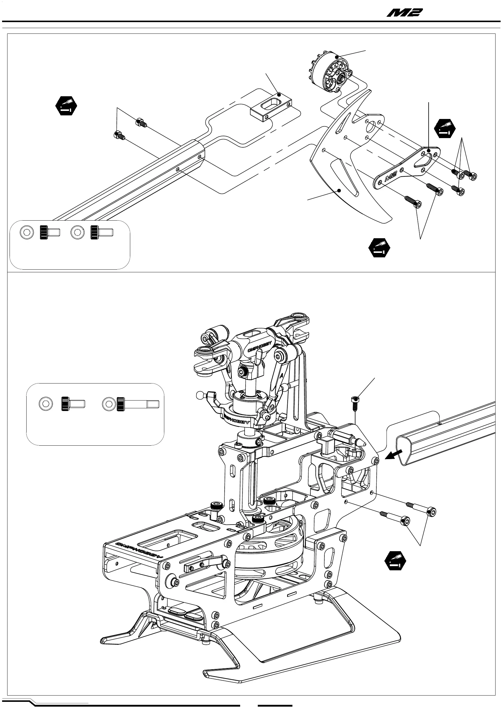 OMP Hobby M2 Explore - Assembly Step 7: Tail Assembly; Tail Motor and Mount Installation; Vertical Wing Attachment