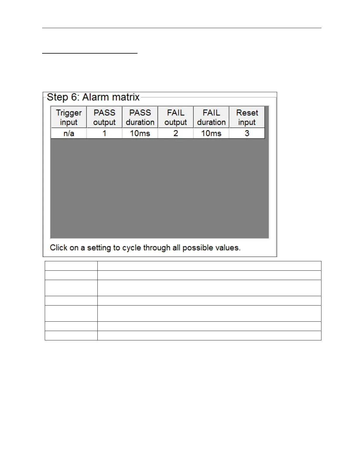 The Alarm Matrix Pass/Fail view displays the pass/fail status of the entire inspection. Click on a setting to cycle