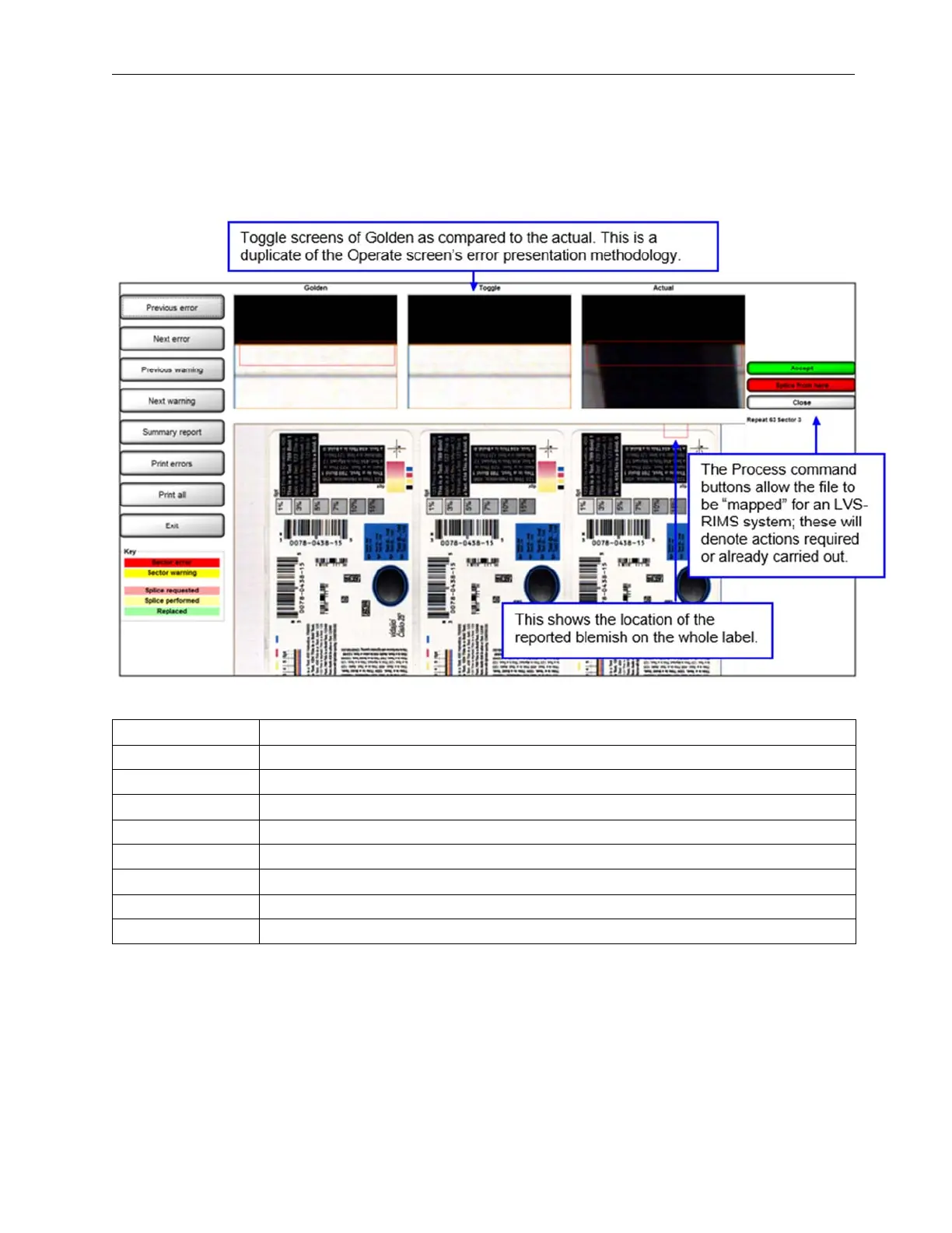 An error display screen will then pop-up. If the error is a blemish, the Golden Image will show on the Left; a