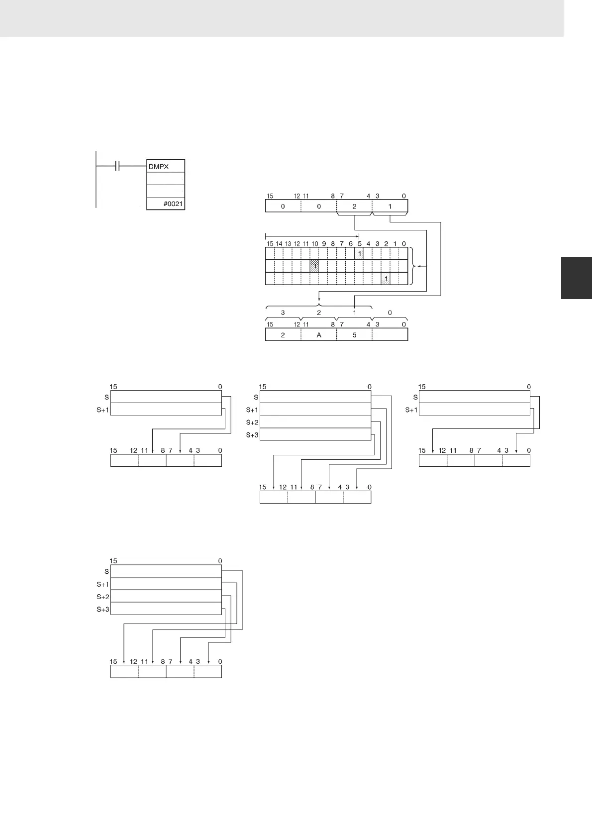 When CIO 0.00 is ON in the following example, DMPX(077) will find the leftmost ON bits in CIO 100,