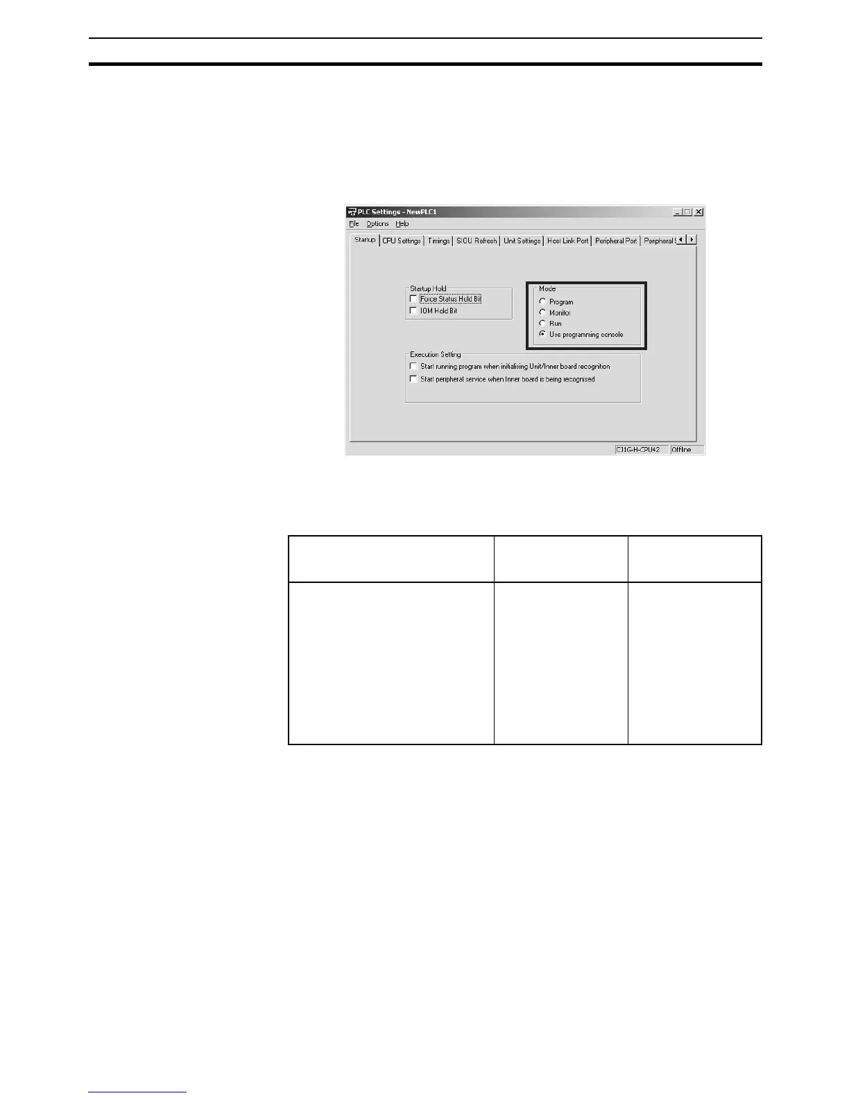 Note The CPU Unit will start in RUN Mode if the PLC Setup's Mode Setting is set to