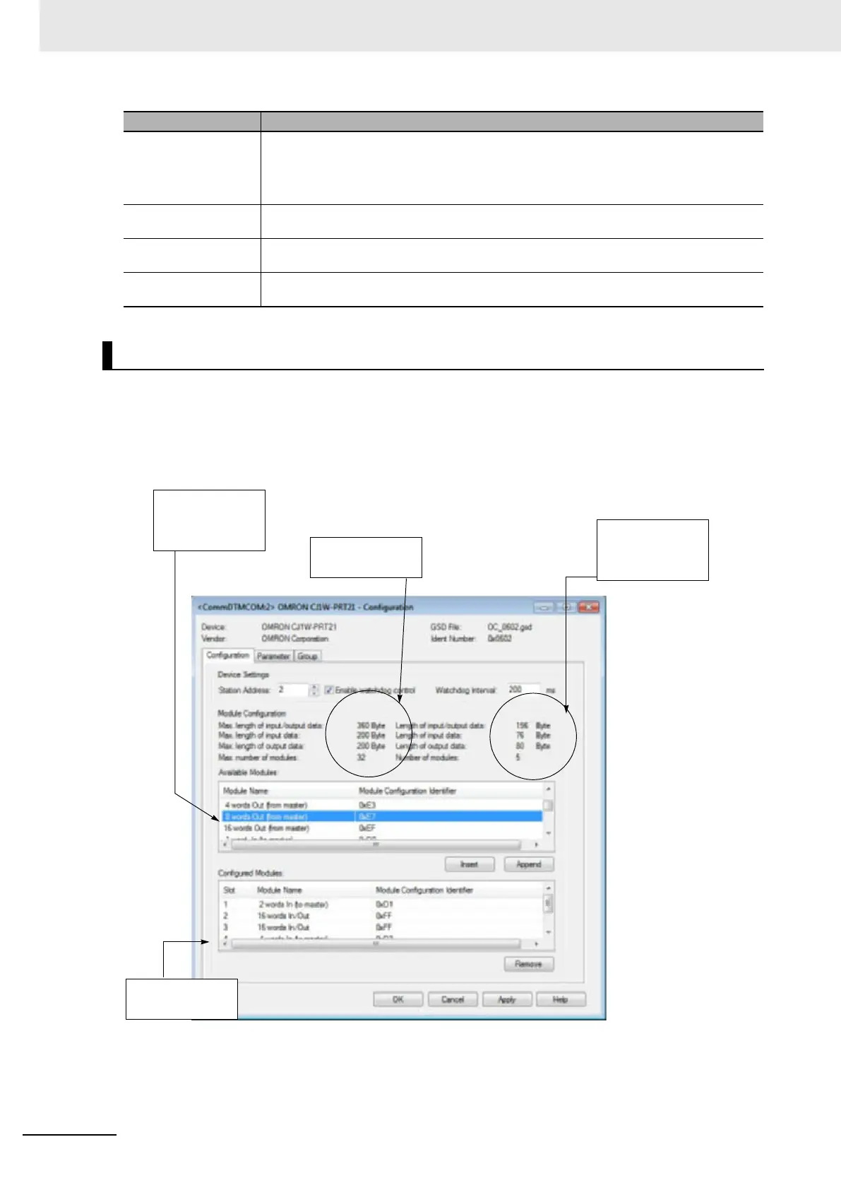 The example below shows a slave configuration screen. The CJ1W-PRT21 is configured as a slave