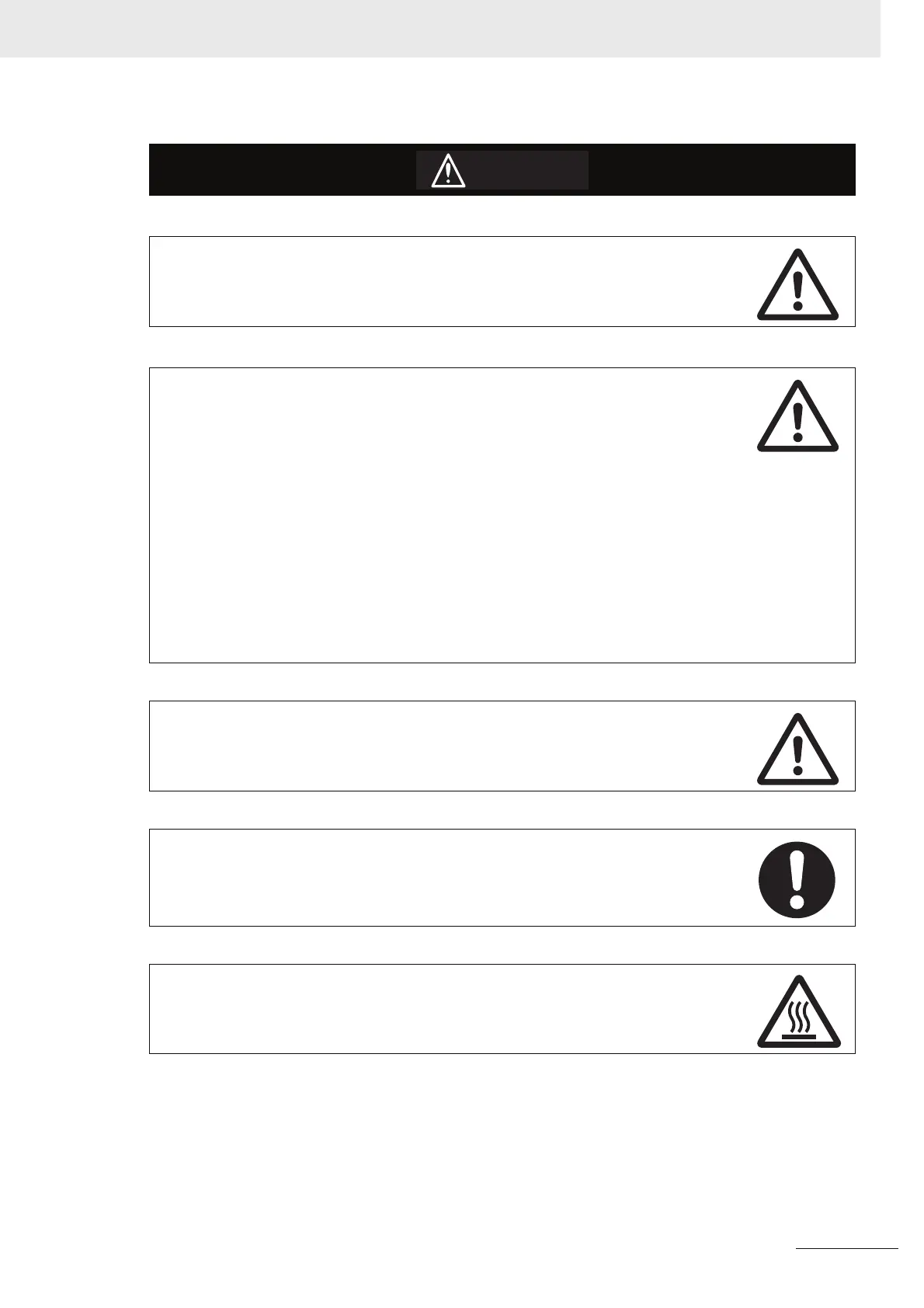 The power supply section and I/O terminal blocks will be hot and you may be burned.