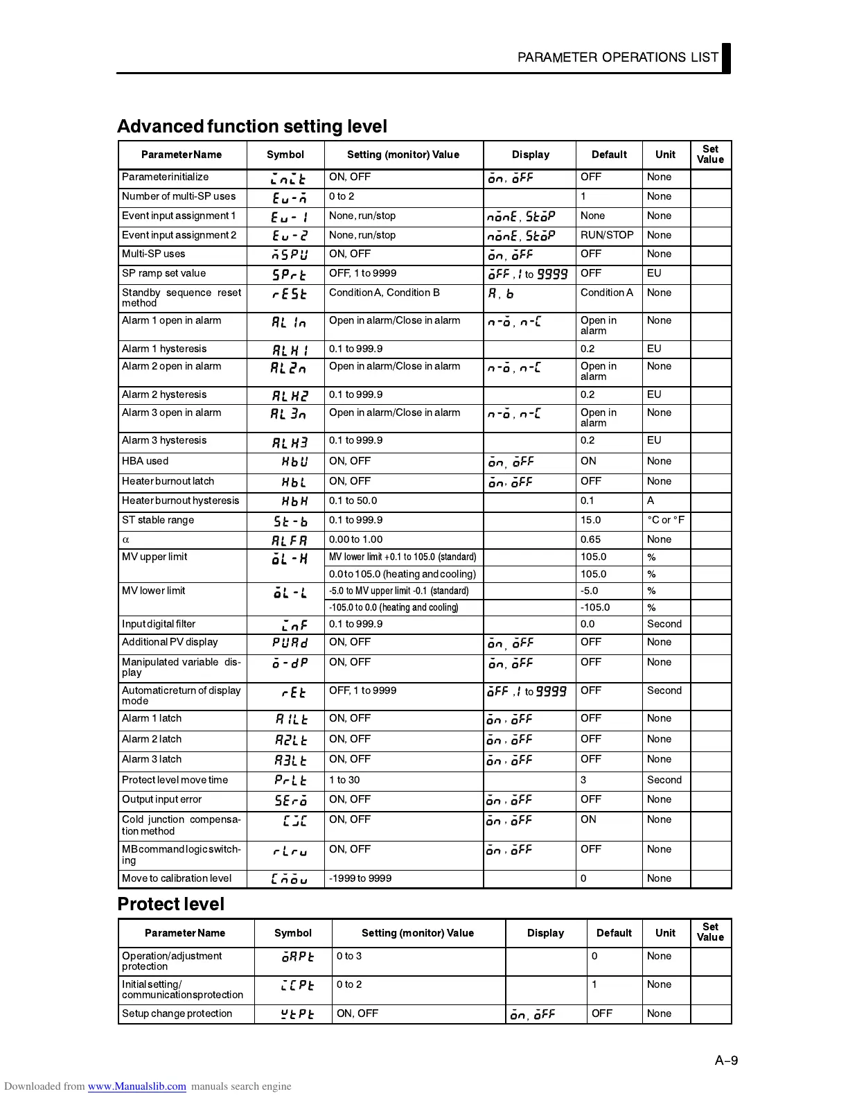 ParameterName Symbol Setting (monitor) Value Display Default Unit