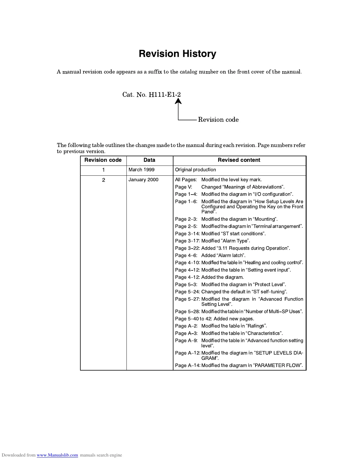A manual revision code appears as a suffix to the catalog number on the front cover of the manual.
