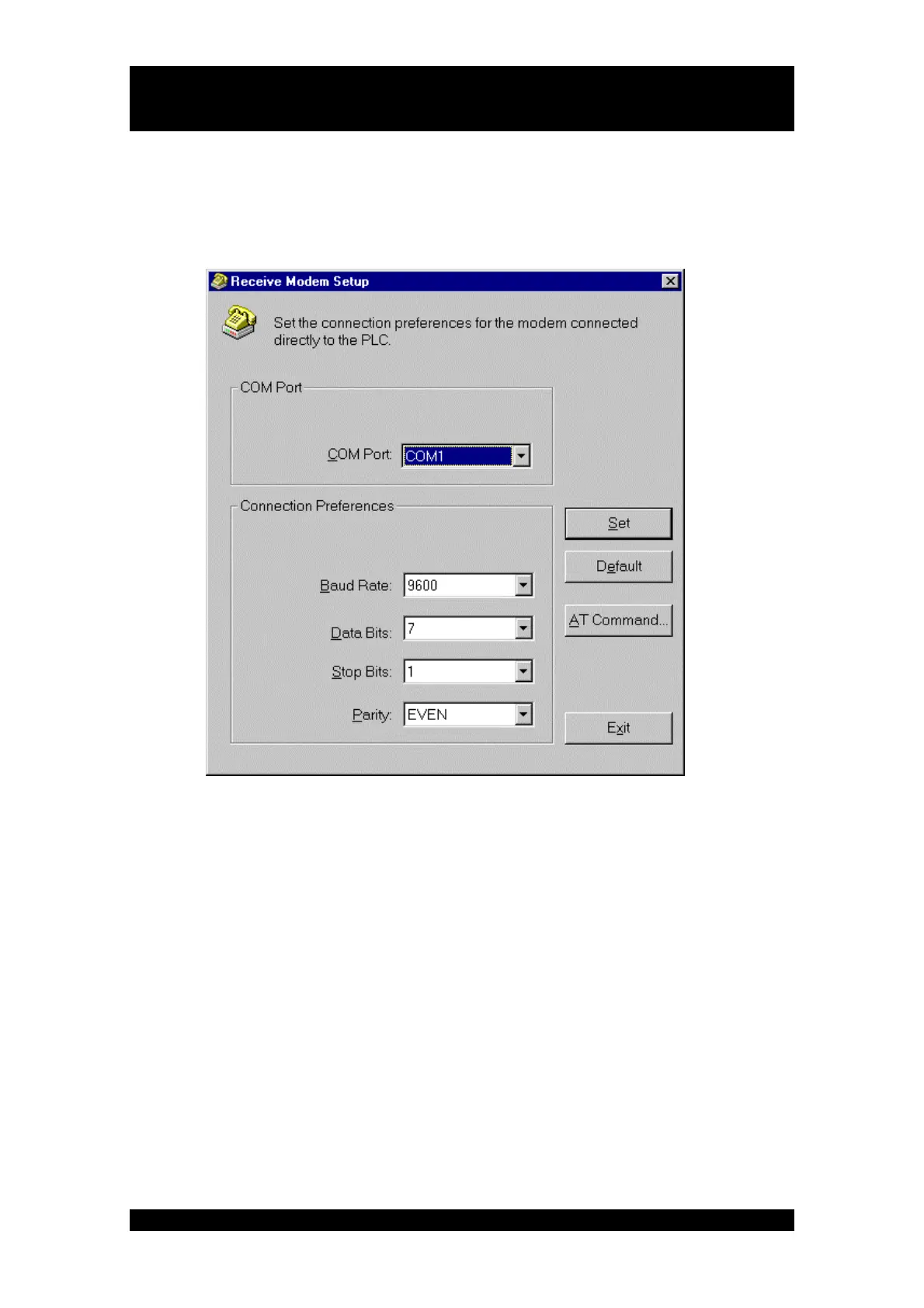 default: BaudRate: 9600bps, Data Bits: 7, Stop Bit: 1, Parity: Even