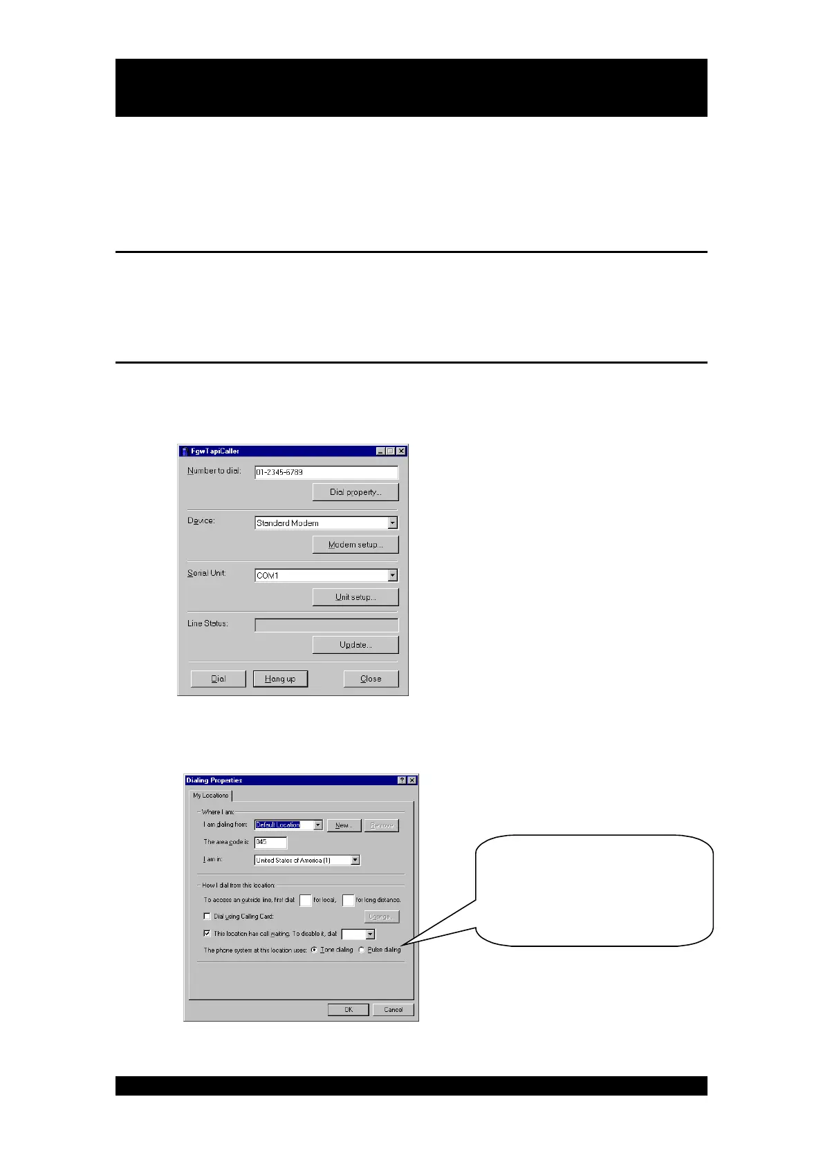 Click on the Dialing Properties button. Select Tone dialing or Pulse dialing in the Dialing
