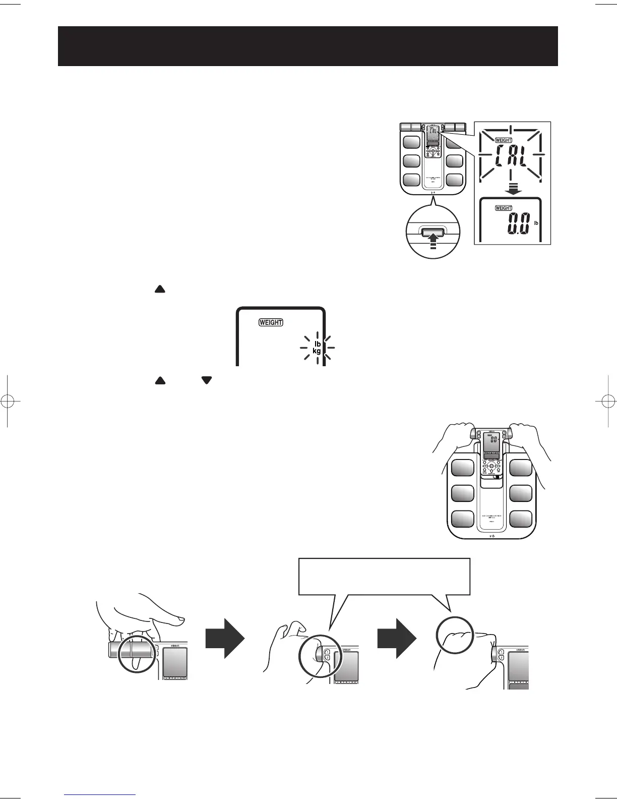 1) Keep the UP button pressed until “lb” and “kg” blink on the display.