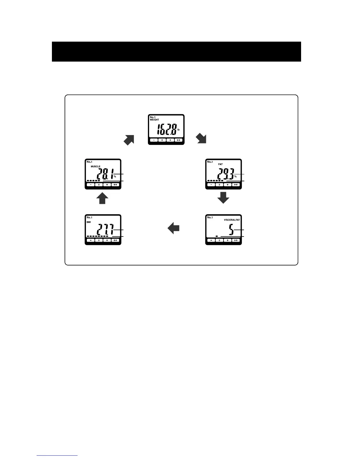 The display changes with each press of the SET/MODE button as follows: FAT -> VISCERAL FAT