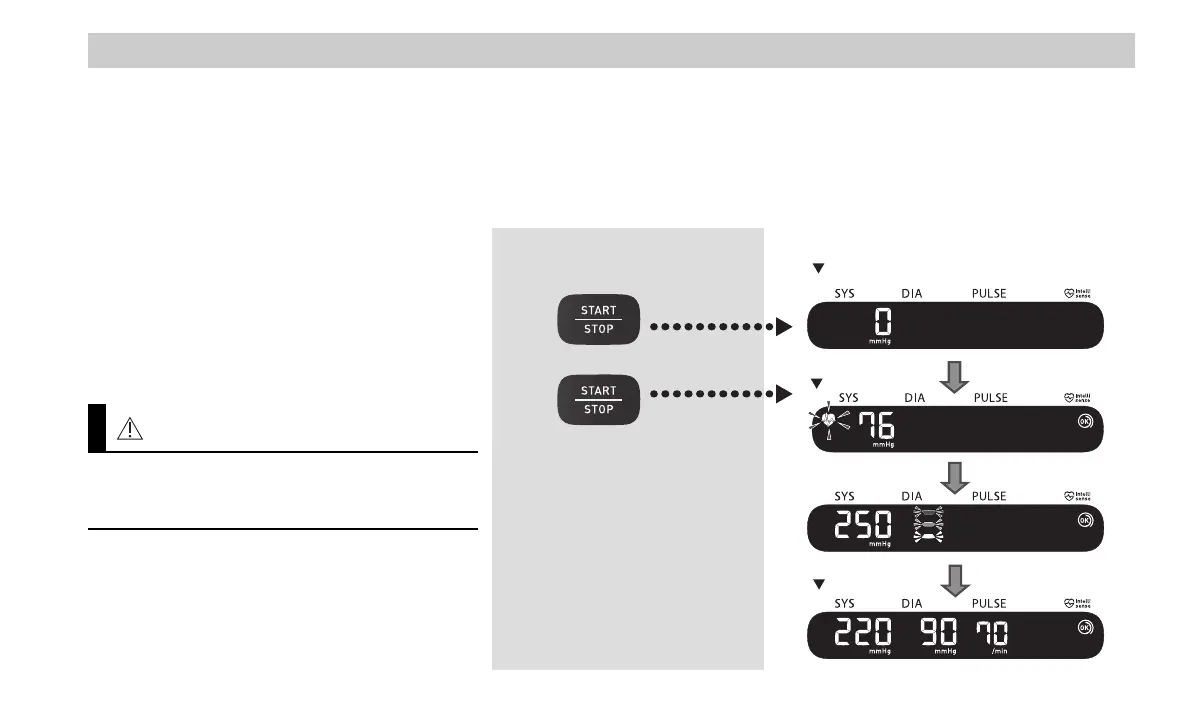 After the arm cuff starts to inflate, press and hold the BP [START/STOP] button until the monitor inflates 30 to 40 mmHg