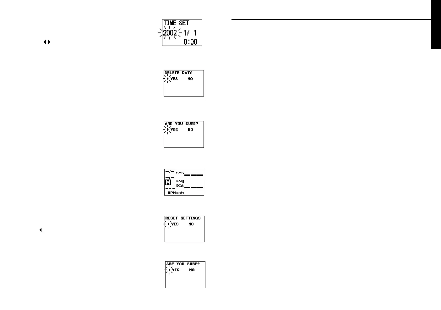 YOU SURE?” After confirmation by selecting YES all the settings will be