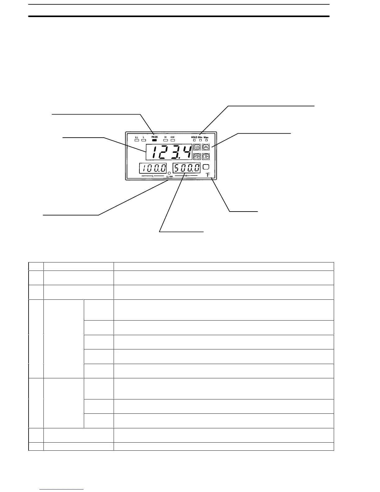 9DOXH /(' 'LVSOD\ IURQW SDQHO 7KH WDEOH JLYHV D EULHI GHVFULSWLRQ RI WKH IXQFWLRQ