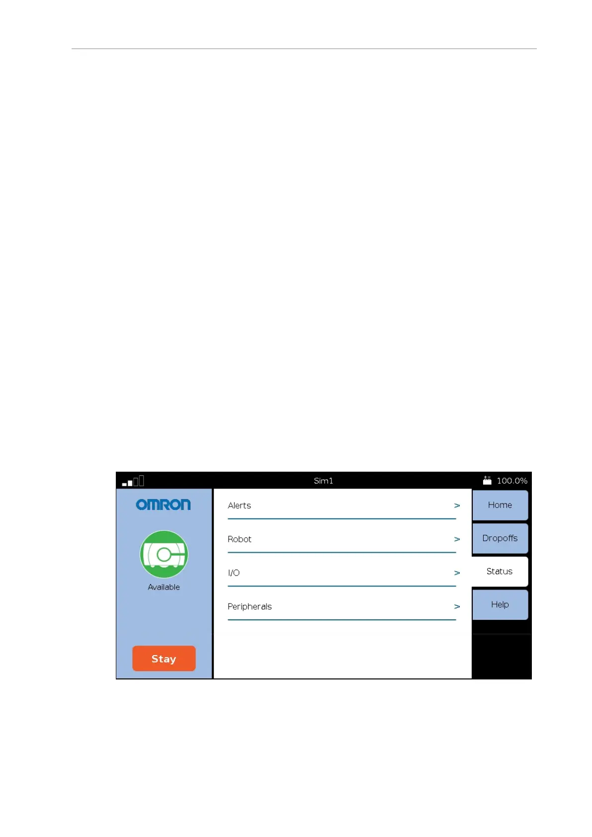 After touching the Status tab, you will be given a choice of either Alerts, Robot, I/O, or Peri-