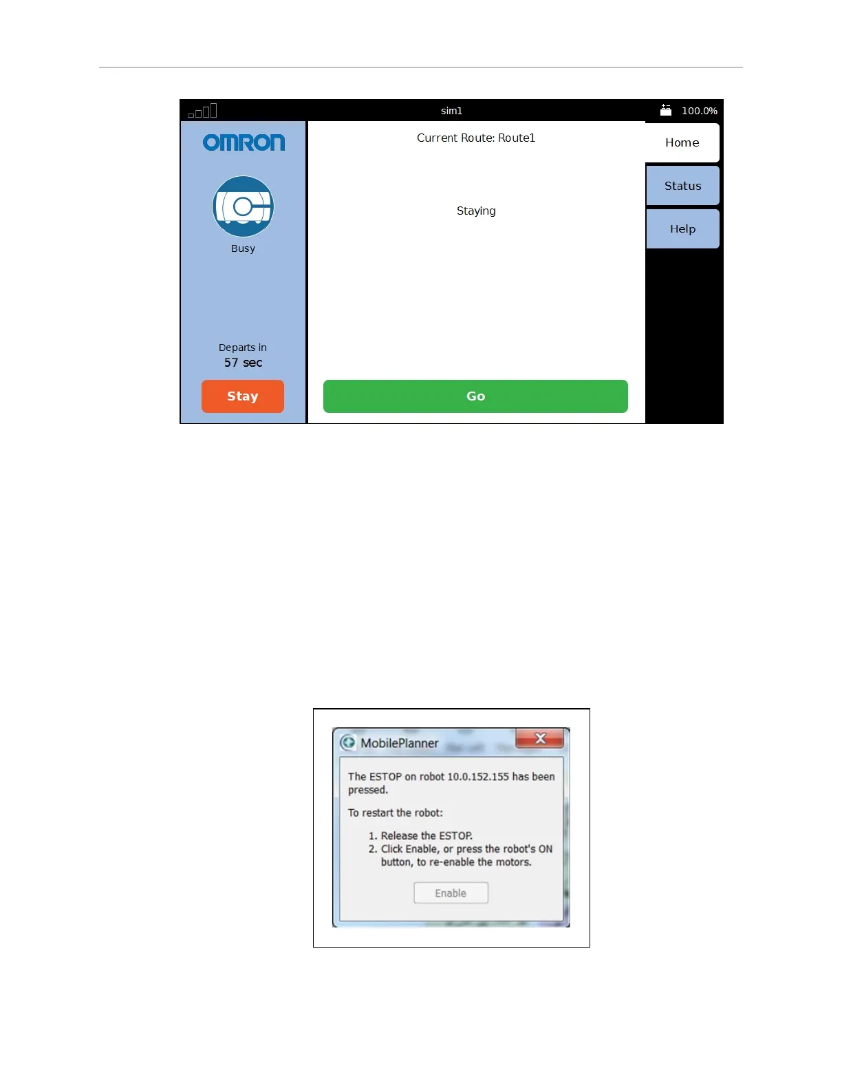 An Operator can touch Stay, to pause the robot, and Go to release it, but the Operator cannot