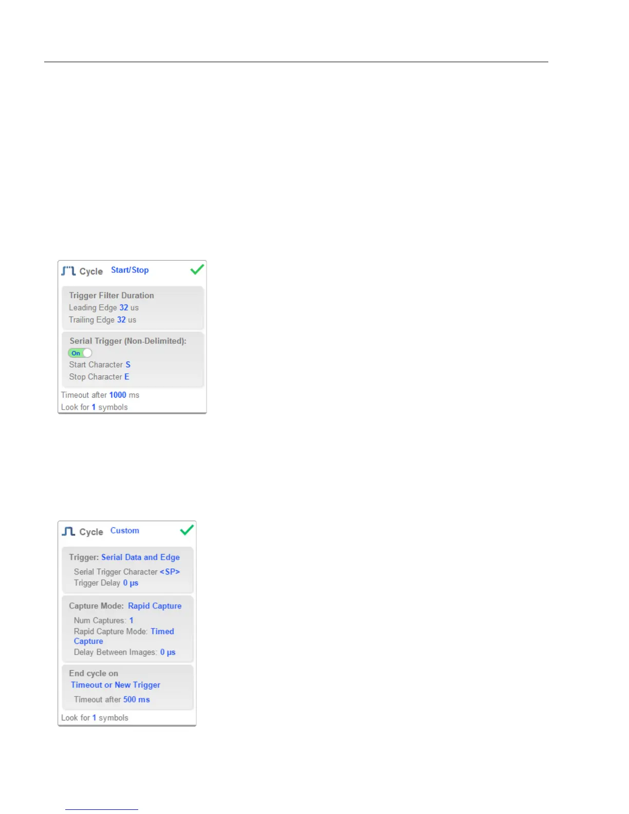 When Serial Trigger is set to On, the start and stop characters are set to S and E. When