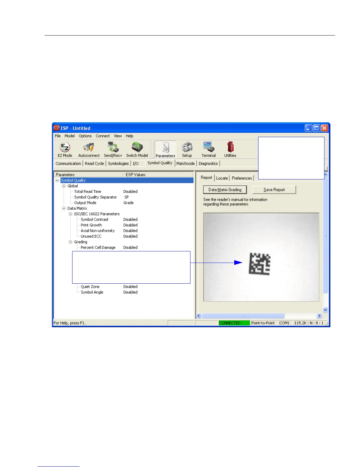 Reports appear in the viewing area underneath the Data Matrix Grading and Save
