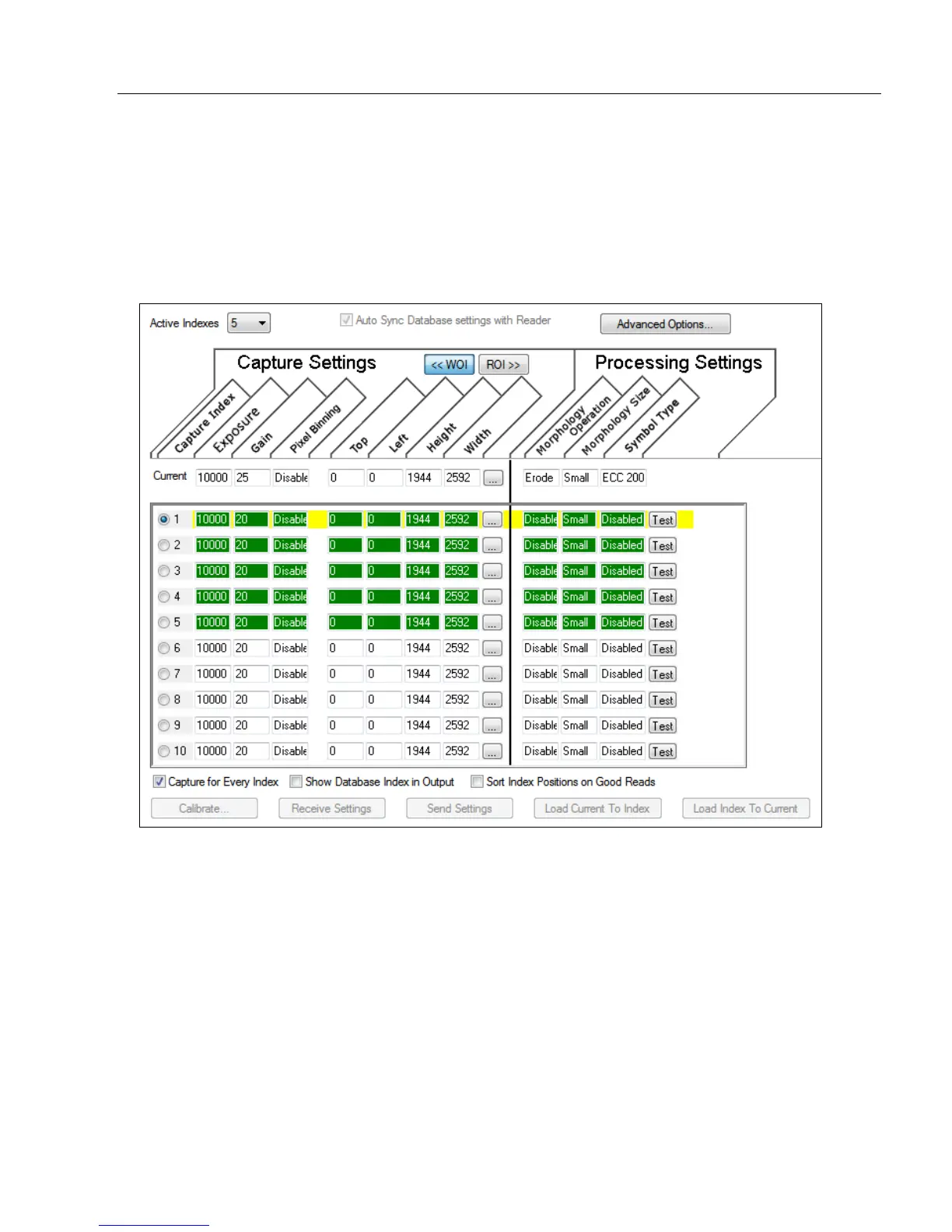 Configuration Database view, 5 Active Indexes, Capture Settings highlighted